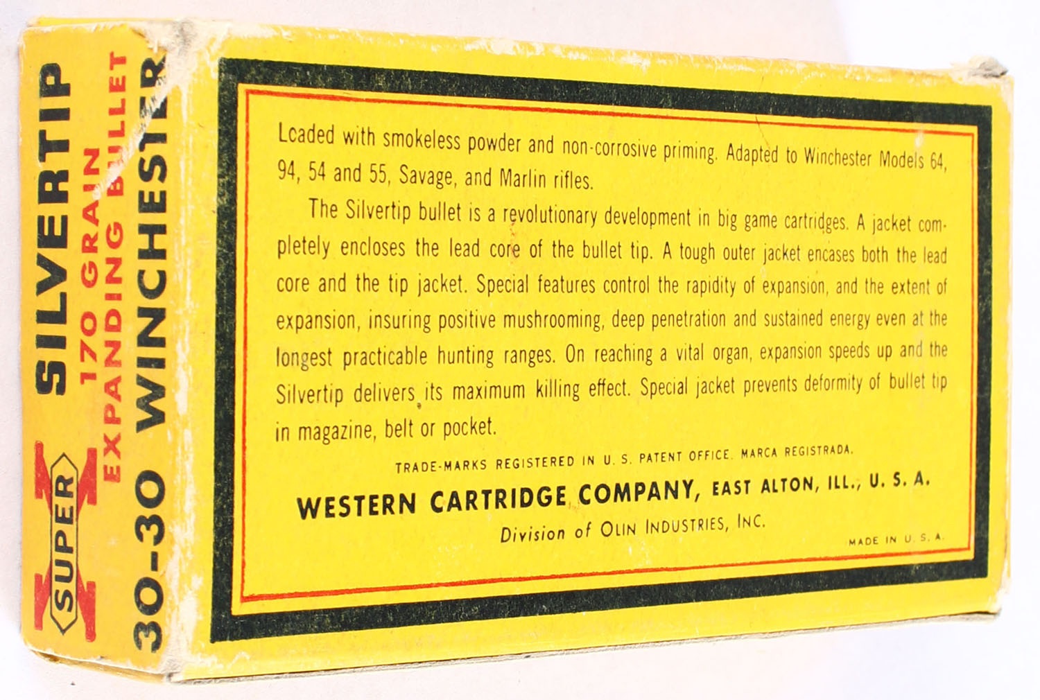 Western, Super-X, .30-30 Winchester, 170 Grain Silvertip Bullet, Controlled Expanding Bullet, Full, 1pc. Yellow blue & red Box, box is very solid with very minor shelf wear, end flaps are solid, ammo is excellent. Grade: Excellent - Value: 40 to 60