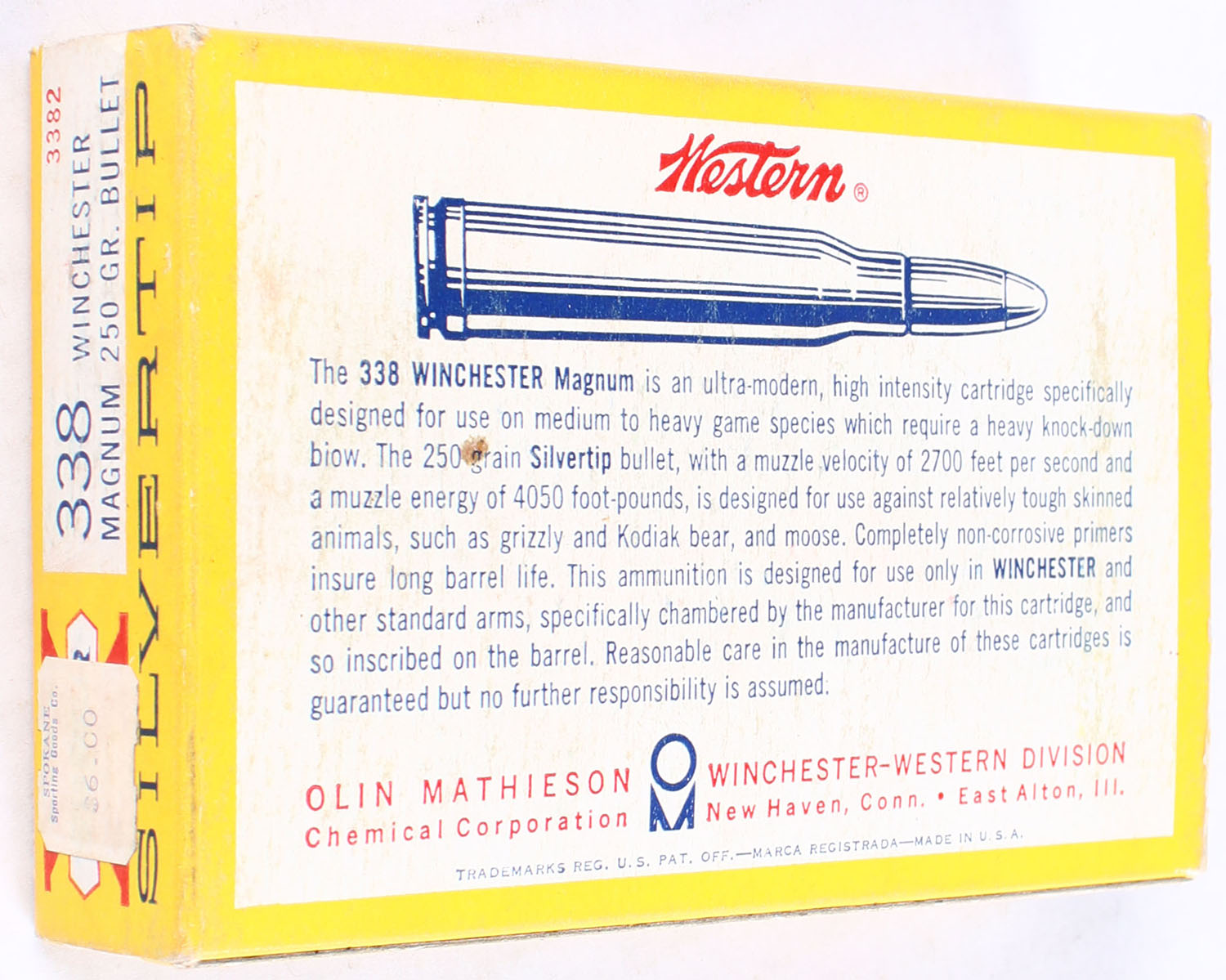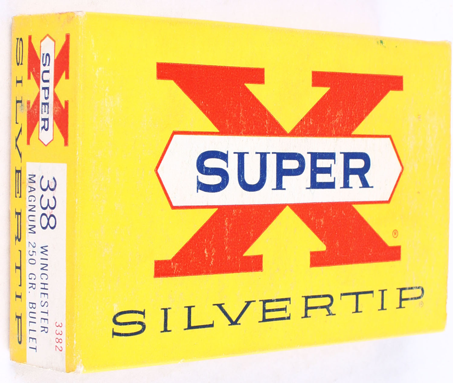 Western, Super X Silvertip, .338 Winchester Magnum, 250 Grain Bullet, Full, 1pc. Yellow white & red box, box is very solid with very good color, edges are mostly crisp, corners are sharp, end flaps are solid, ammo is excellent. Grade: Excellent + - Value: 60 to 90
