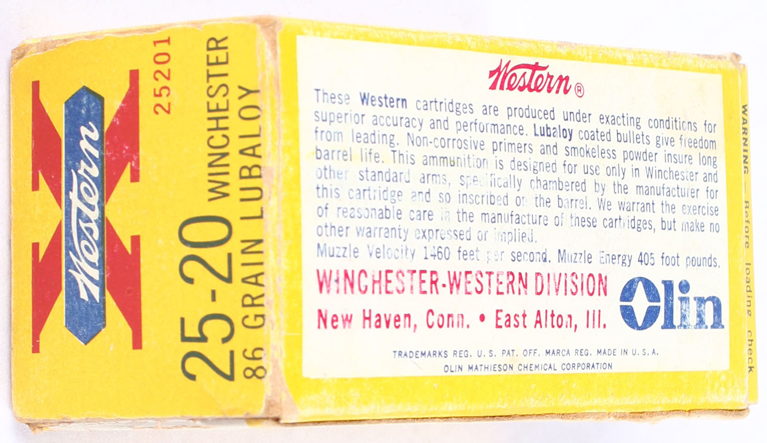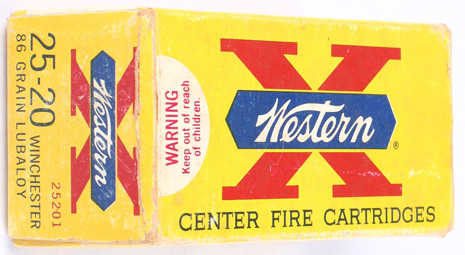 Western, X, .25-20 Winchester, 86 Grain Lubaloy, Full, 1pc. Yellow white & red box, box is solid with good to very good color, very minor age soiling & edge wear, end flaps are solid, ammo is excellent. Grade: Very Good ++ - Value: 120 to 180