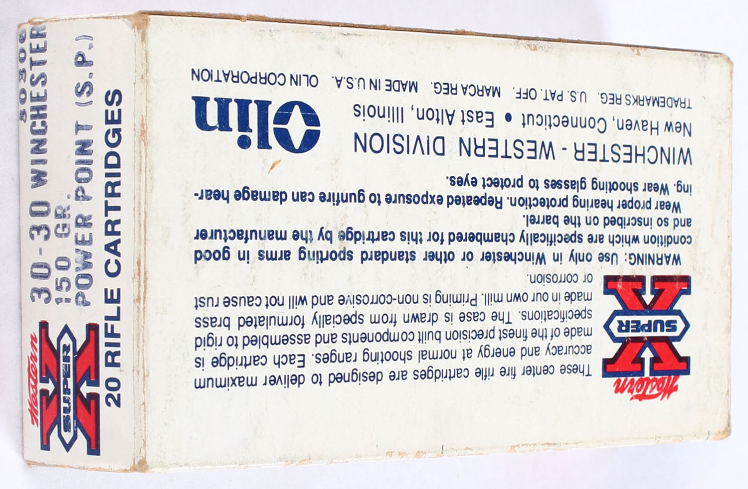 Western, Super X, .30-30 Winchester, 150 Grain Power Point, Full of mixed ammo, 1pc. White red & black box, box is solid with good color, has edge & corner wear, end flaps are solid, ammo is very good. Grade: Very Good ++ - Value: 20 to 30