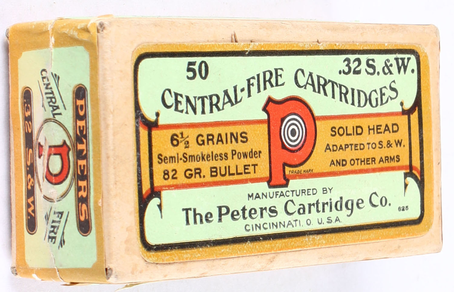 Peters, Central-Fire Cartridges, .32 Smith & Wesson, 82 Grain Solid Head Bullet, Empty, 2pc. Buff box with green/orange top & side sealing labels, box is very solid with excellent color, labels are intact. Grade: Excellent + - Value: 10 to 25