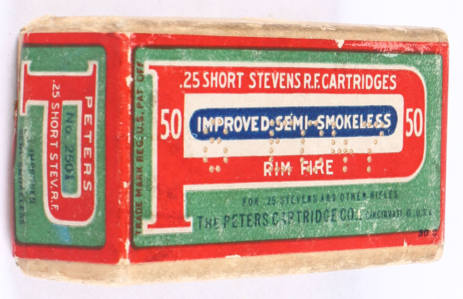 Peters, R.F. Cartridges, .25 Short Stevens Rim Fire, Improved Semi-Smokeless, Full, 2pc. Buff box with green red & blue labels, box is solid with very good to excellent color, minor age soiling & color fading, very minor corner wear, edges are crisp, labels are intact, ammo is excellent. Grade: Very Good ++ - Value: 50 to 200