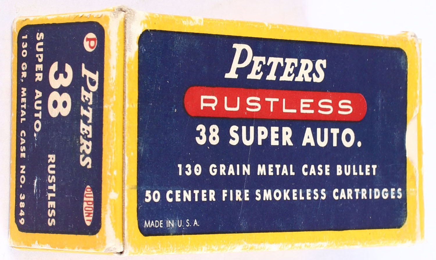 Peters, Rustless, .38 Super Auto., 130 Grain Metal Case Bullet, Full, 1pc. Blue yellow & red box, box is solid with excellent color, minor shelf wear, some corner wear, very minor edge wear, end flaps are solid, ammo is excellent. Grade: Excellent - Value: 30 to 60
