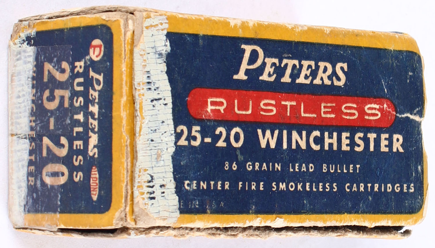 Peters, Rustless, .25-20 Winchester, 86 Grain Lead Bullet, Full, 1pc. Blue yellow & red box, box has seam splits with age soiling, has tape residue on box, missing right end flap, ammo is excellent. Grade: Excellent - Value: 80 to 120