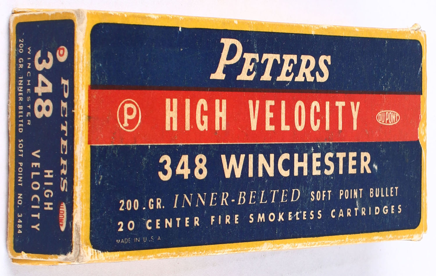 Peters, High Velocity, .348 Winchester, 200 Grain Inner-belted soft point bullet, Full, 1pc. Blue yellow & red box, box is solid with great color, box has scuffing with edge & corner wear, end flaps are solid, ammo is excellent. Grade: Very Good ++ - Value: 50 to 80