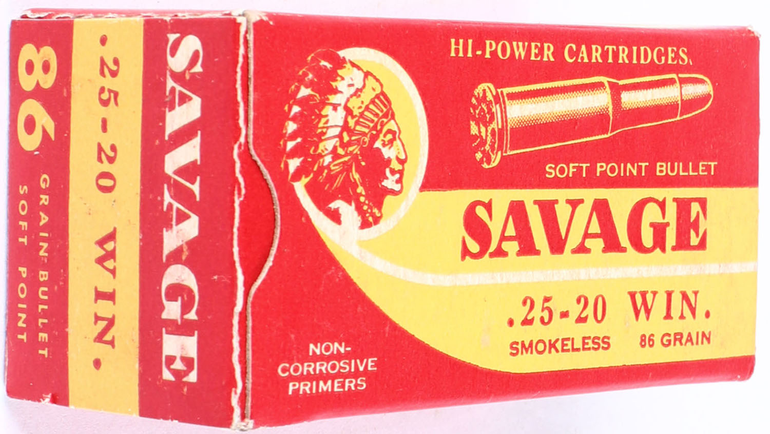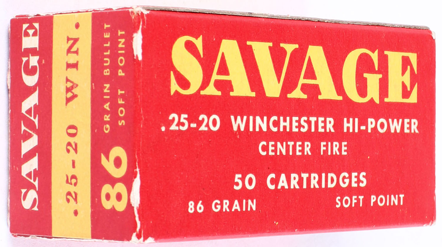 Savage, Hi-Power Cartridges, .25-20 Winchester, 86 Grain Soft Point, Full, 1pc. Red & yellow box, box is very solid with excellent color, end flaps are solid, ammo is mint. Grade: Excellent ++ - Value: 80 to 120
