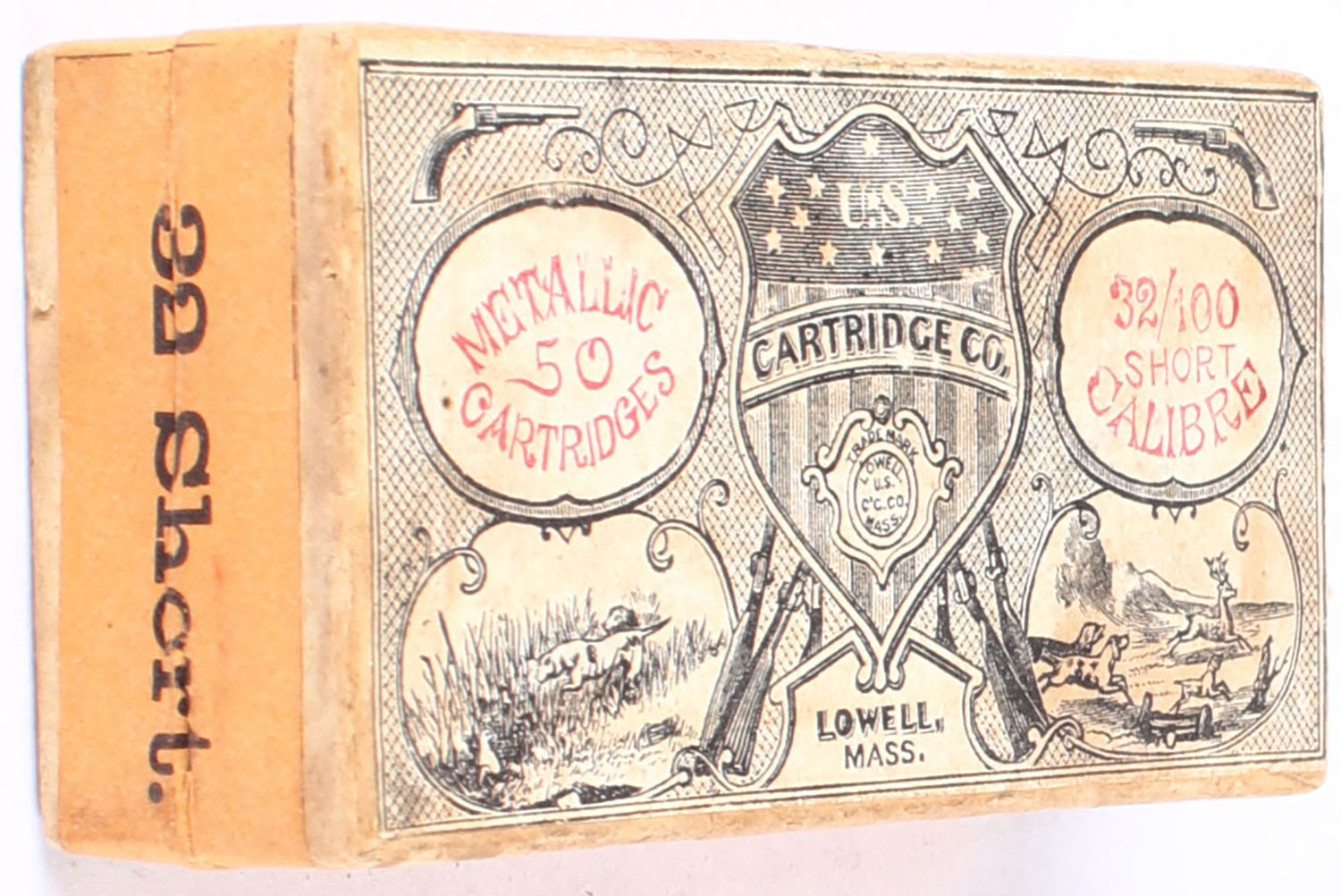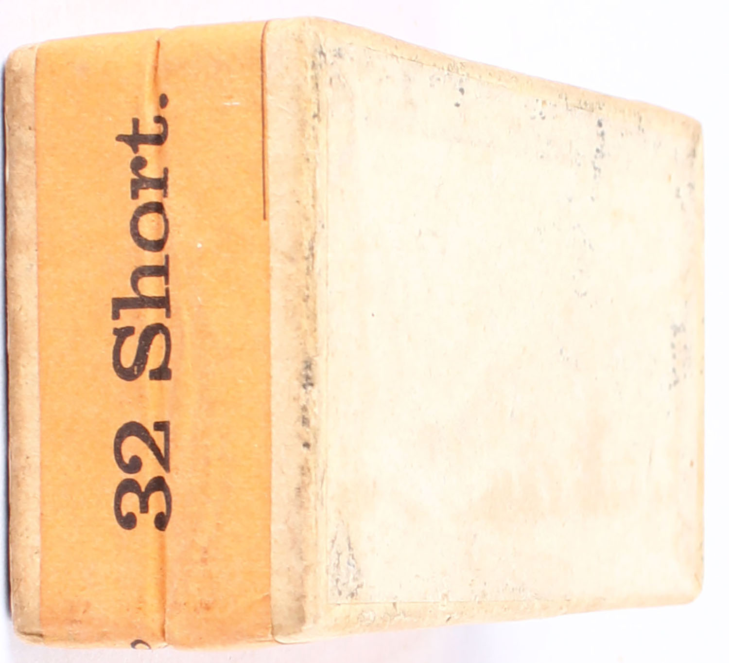 U.S., Metallic Cartridges, .32 Short, FULL & SEALED, 2pc. Buff box with gray top & orange side sealing labels, box is solid with excellent color, minor staining on top, very minor corner wear, edges are mostly crisp, labels are intact. Grade: Excellent - Value: 100 to 200