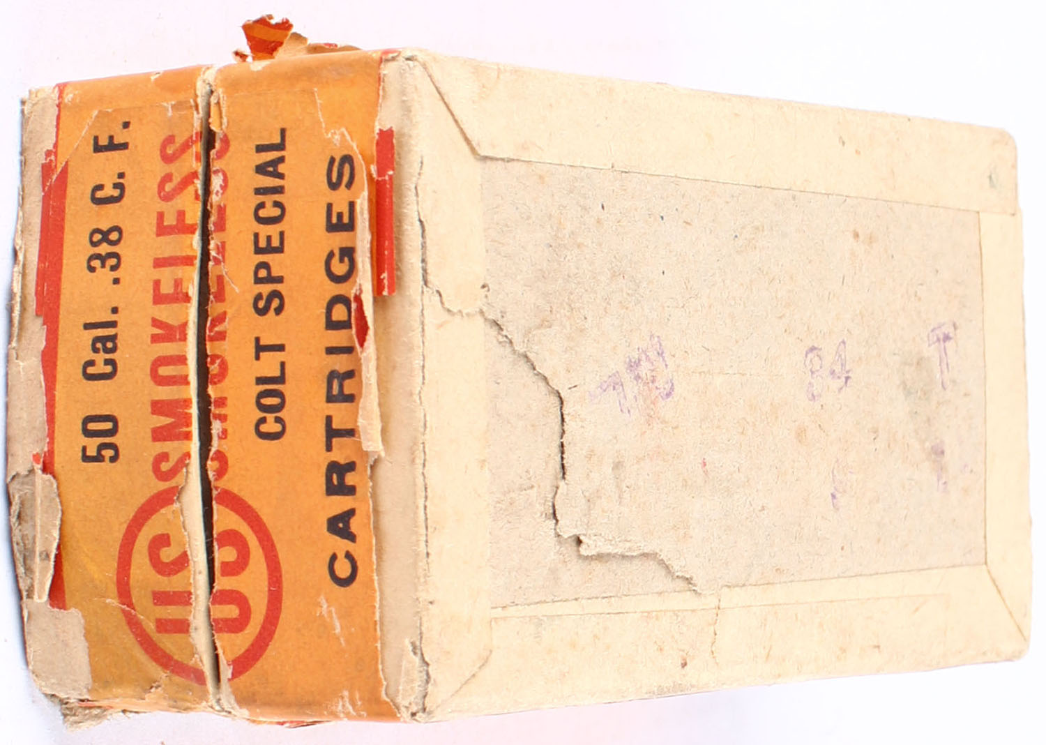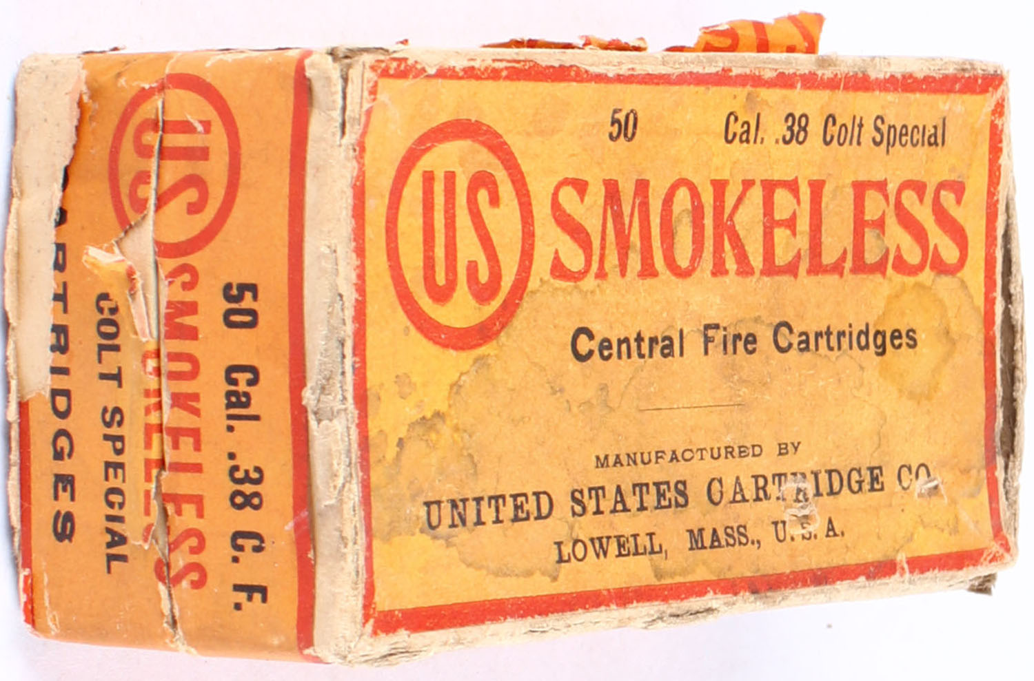 U.S., Smokeless Central Fire Cartridges, .38 Colt Special, Partial 30rds., 2pc. Buff box with orange & red top & side sealing labels, box is solid with very good color, age soiling, partial seam splits, edge & corner wear, side sealing label is 90% intact, ammo is excellent. Grade: Good ++ - Value: 10 to 40