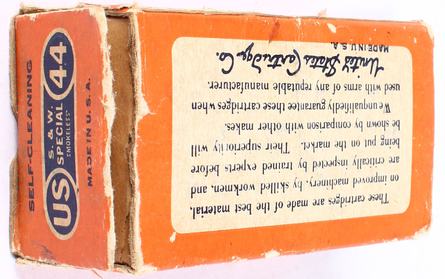 U.S., Central Fire Cartridges, .44 Smith & Wesson, Self Cleaning Smokeless, Full, 1pc. Orange & blue box, box has torn end flaps with age soiling, edge & corner wear, rub marks & tape repair to edge, ammo is very good. Grade: Good - Value: 20 to 60