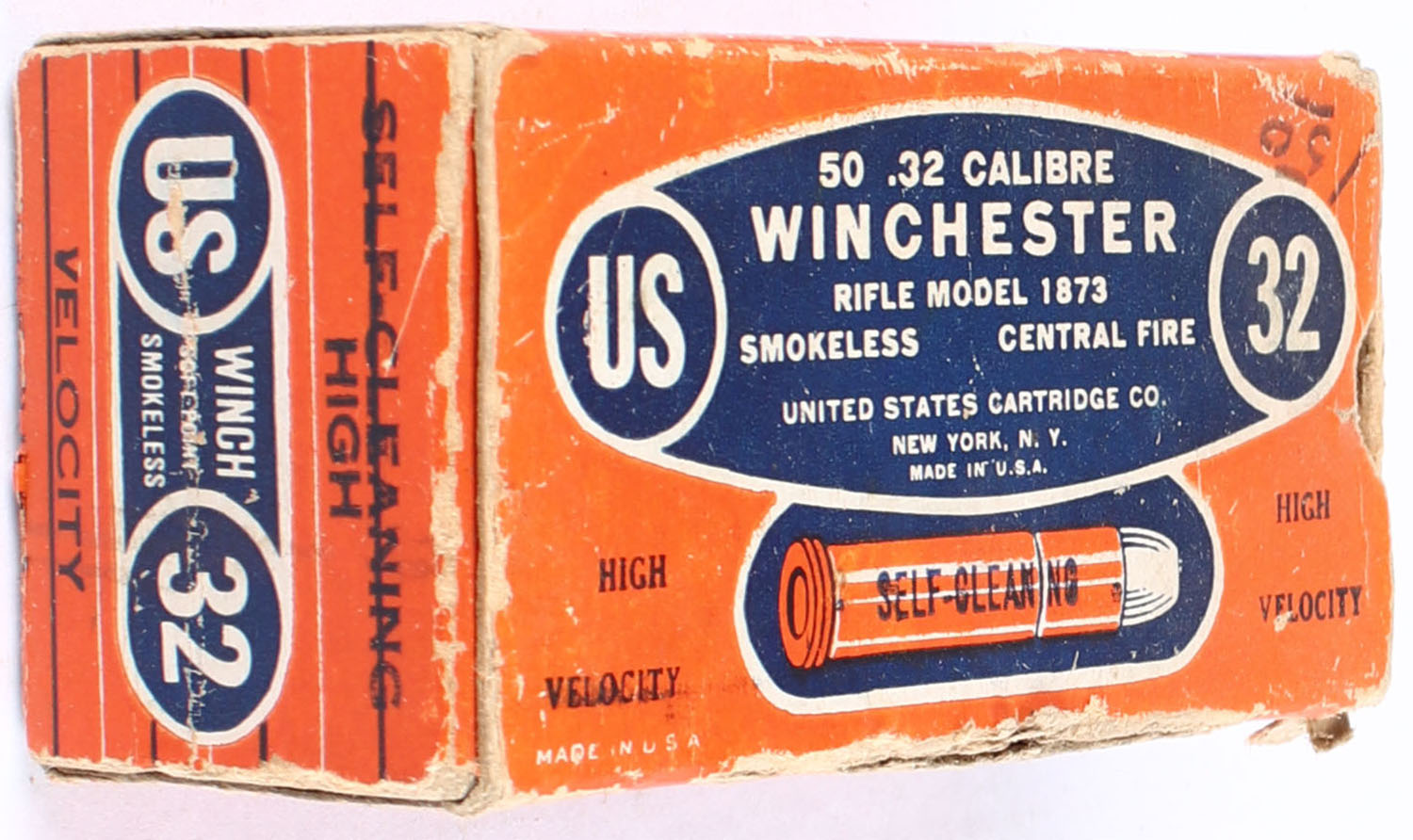 U.S., Central Fire Cartridges, .32 Winchester, Self Cleaning Smokeless, Partial 38rds., 1pc. Orange & blue box, box has shelf wear with edge & corner wear, box is missing right end flap, ammo is very good. Grade: Good ++ - Value: 10 to 30
