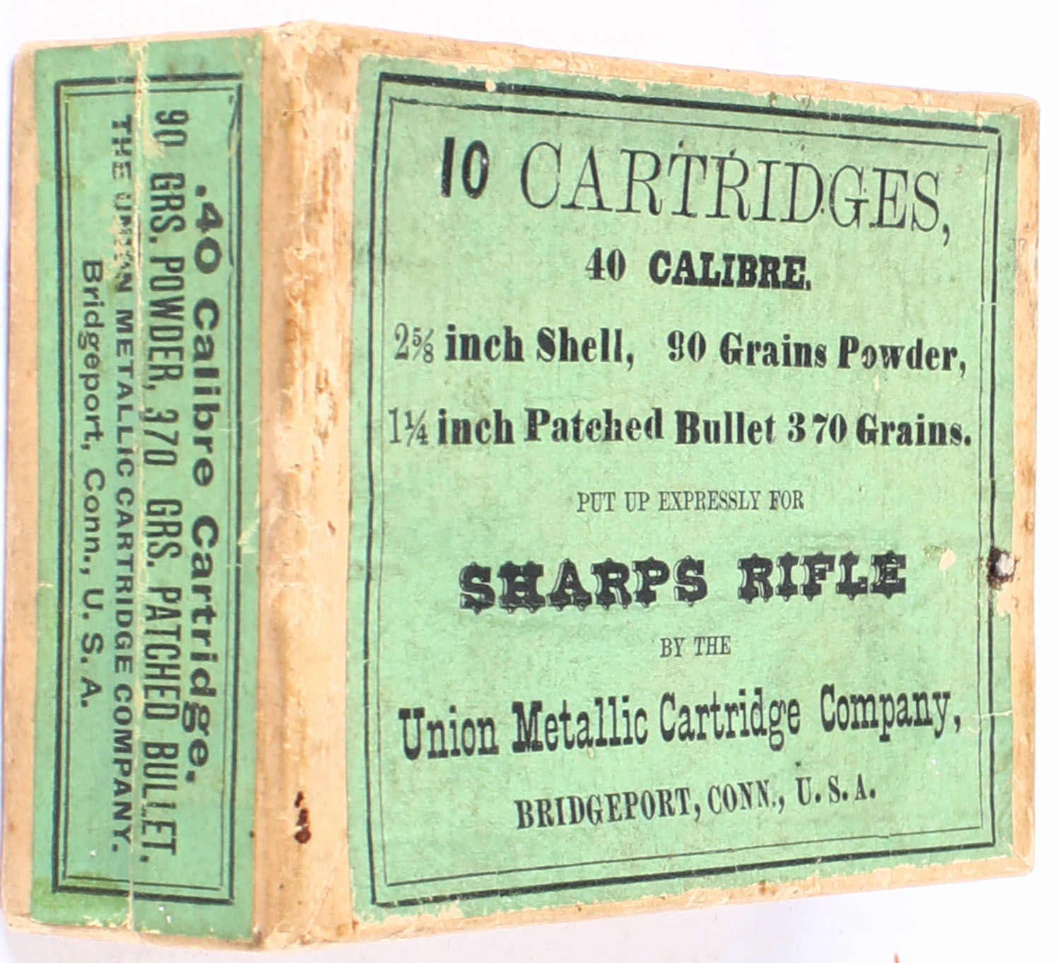 UMC, .40 Cal Straight Shell for Sharps Rifle, 90 grs. Powder, 370 gr. Patched Bullet, FULL & SEALED, 2pc. 2 5/8'' shell, 1 1/4'' patched bullet, Buff box with green label, box is solid with very good to excellent color, minor age soiling & shelf wear, has edge & corner wear, label is intact. Grade: Excellent - Value: 150 to 400