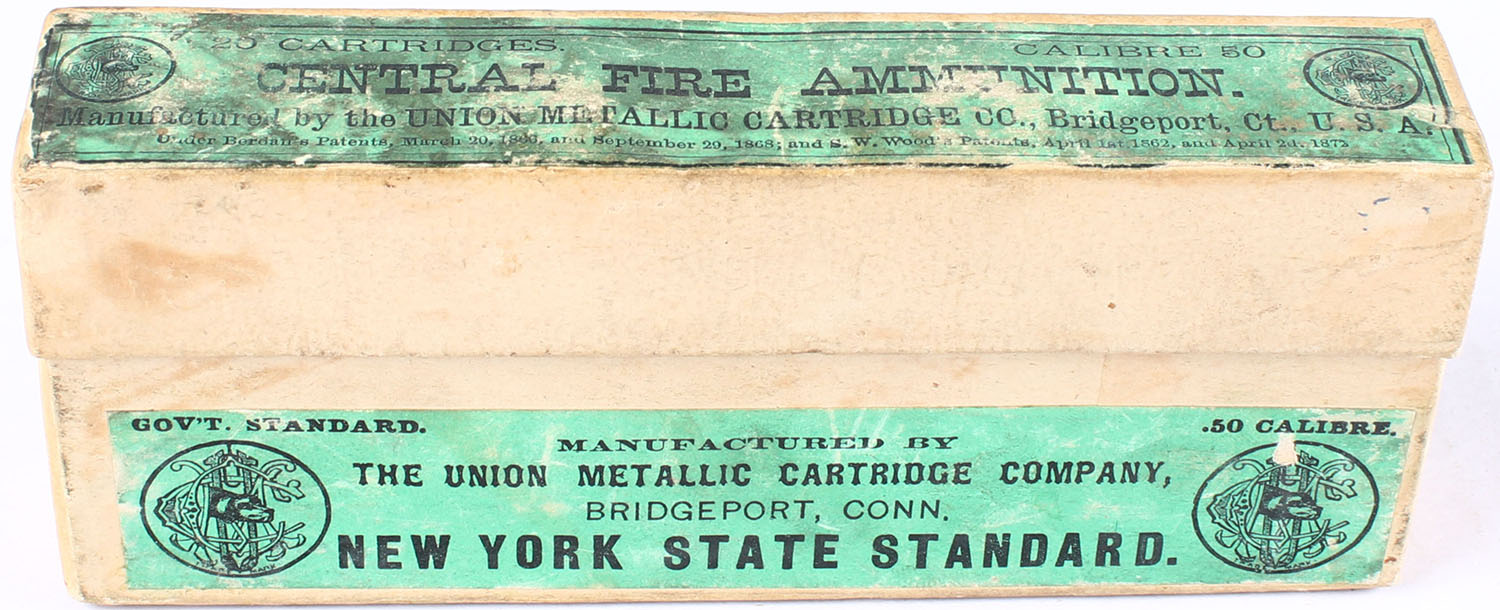 UMC, .50 Cal., Dog Head Logo, Full, 2pc. Buff box with green and black label, box has age soiling and light scuffing, light edge & corner wear, ammo is good. Grade: Very Good - Value: 100 to 150