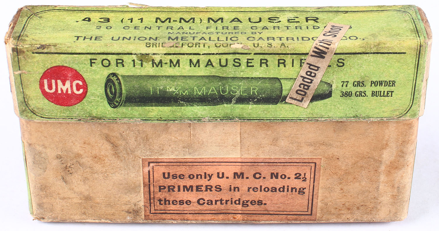UMC, Central Fire Cartridges, .43 (11mm) Mauser, 77 Grain Powder, 380 Grain Bullet, has Overstamp ''Loaded with shot'', Full with paper sabot shot, 2pc. Buff box with green label, box has age soiling with fair color, edge & corner wear, partial seam split to bottom, ammo is good. Grade: Good + - Value: 30 to 60