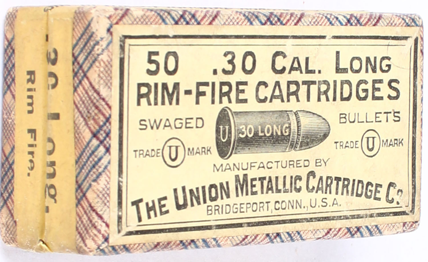 UMC, Rim Cartridges, .30 Long Cal., Full & Sealed, 2pc. plaid box with green top & side labels, box is solid with great color. Grade: Excellent + - Value: 50 to 150