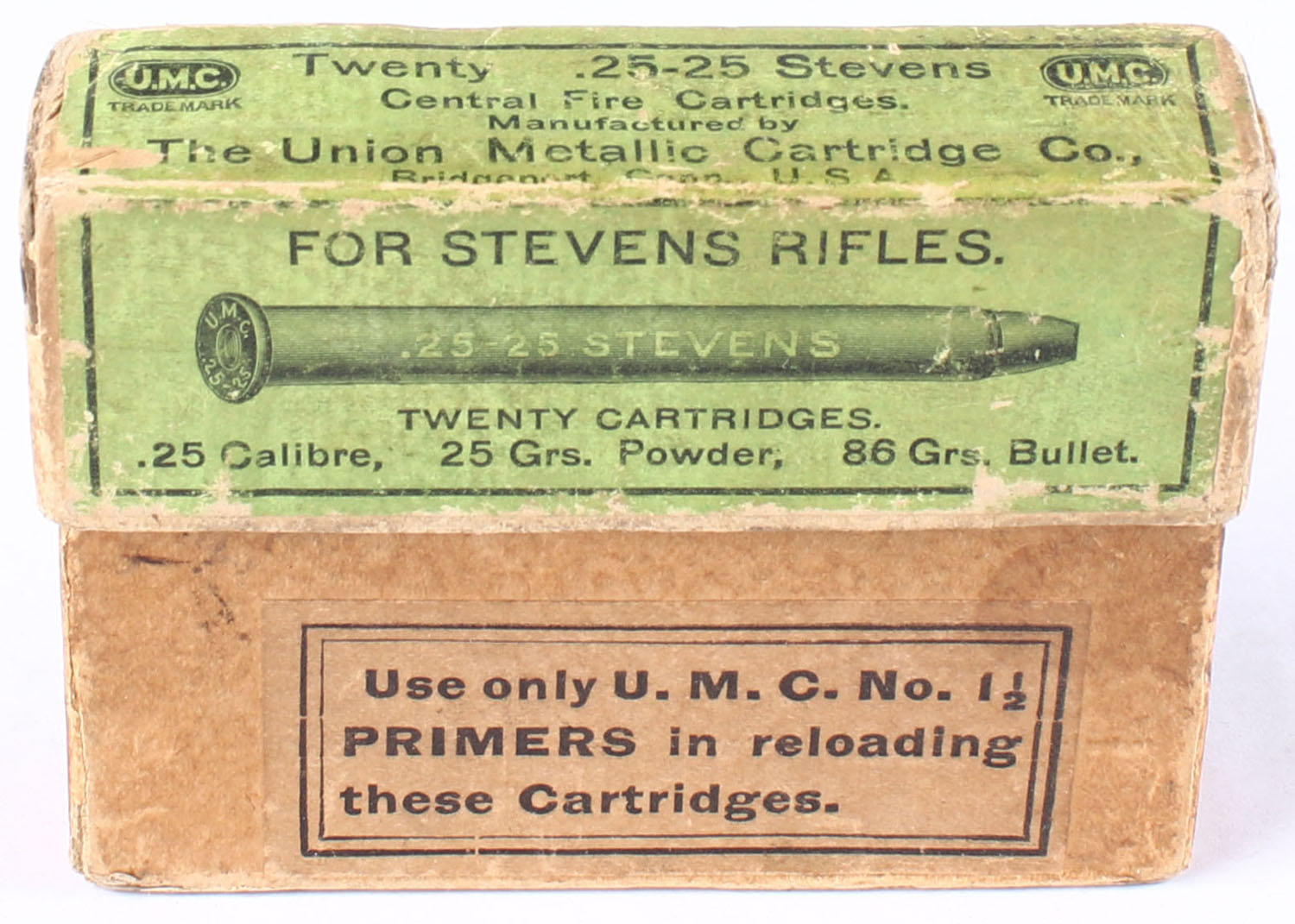 UMC, Center-Fire Cartridges, .25-25 Cal., Full, 2pc. tan box with green top & side labels, box is solid with some scuffing, ammo is excellent. Grade: Very Good ++ - Value: 50 to 150