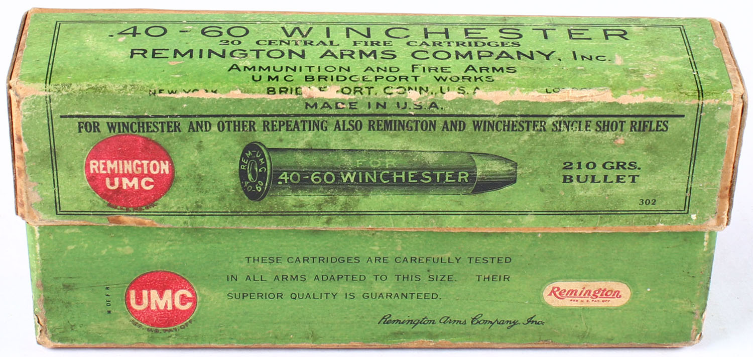 REM-UMC, .40-60 Winchester, 210 Grain Bullet, Partial 3rds plus 10 more with different H/S's, 2pc. Buff box with green labels, box is very solid & label is 98% intact, nice color to label, ammo is excellent. Grade: Excellent + - Value: 30 to 100
