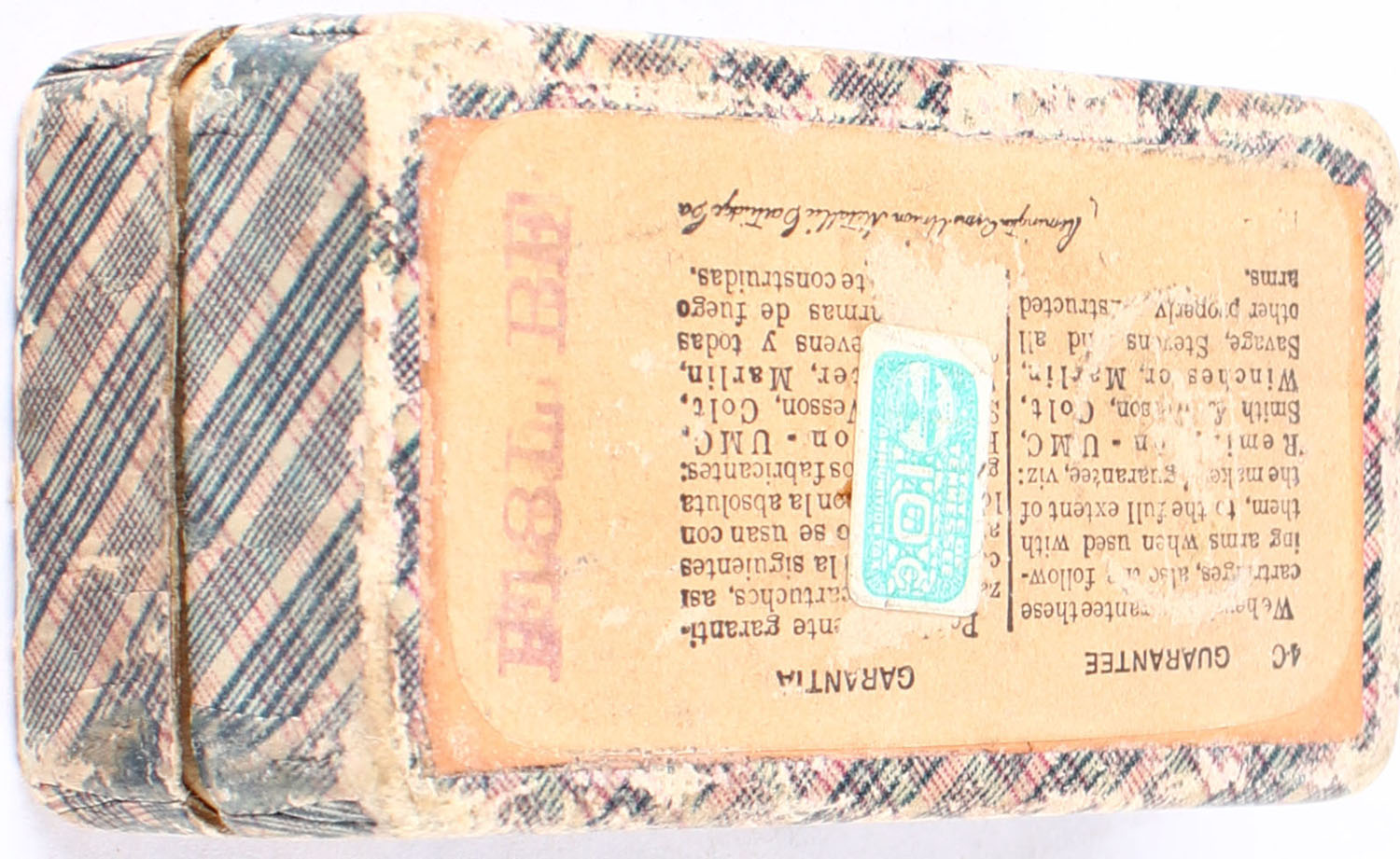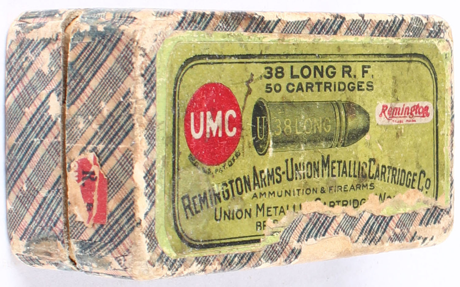 REM-UMC, .38 Long Rim Fire, 150 Grs. Bullet, Full, 2pc. Fabric colored box with green top side sealing label, no side label, box is solid with edge wear & scuffing to top label, ammo is very good with oxidation to bullets. Grade: Very Good - Value: 24 to 36