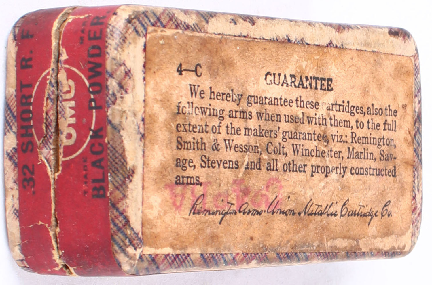 REM-UMC, .32 Short Rim Fire, Black Powder, Full, 2pc. Blue fabric box with red top & side sealing labels, box is solid with very good color, age soiling, shelf wear, edge & corner wear, labels are intact, ammo is good. Grade: Very Good + - Value: 30 to 90