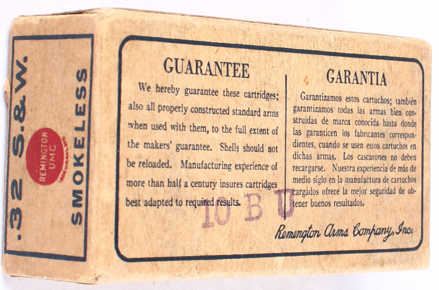 REM-UMC, .32 Smith & Wesson, Smokeless Central Fire Cartridges, 88 Grain Lead Bullet, Full, 1pc. Buff box with black & red print, box is very solid with great color, has very minor shelf wear, ammo is very good. Grade: Excellent + - Value: 30 to 90