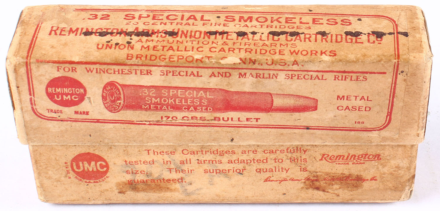REM-UMC, Metallic Cartridges, .32 Special, Smokeless, 170 Grain Metal Cased, Partial 19rds. 2pc. Buff box with red & buff label, box has light age soiling, edge & corner wear, ammo is good. Grade: Very Good - Value: 20 to 50