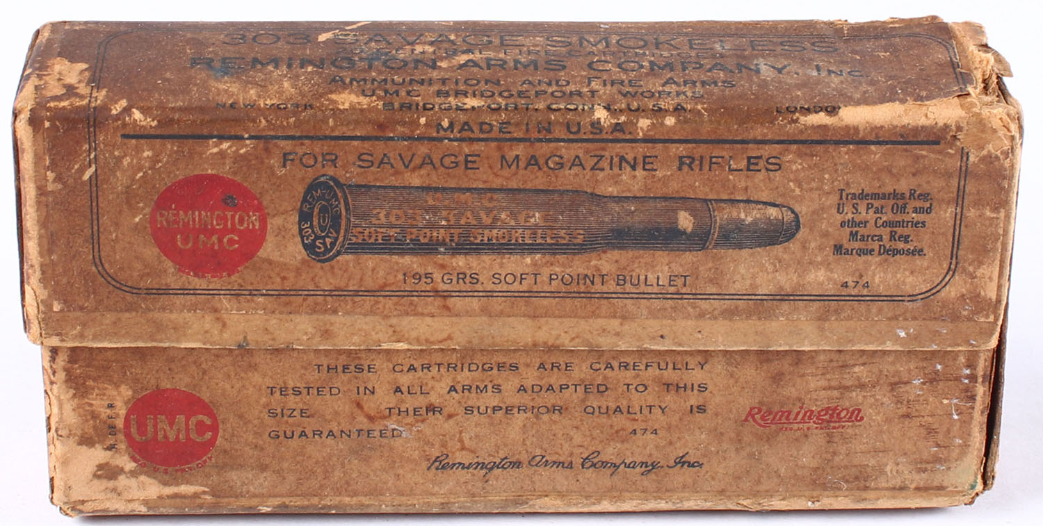 REM-UMC, .303 Savage, Smokeless Powder, 195 Grain Soft Point Bullet, Partial 11rds, 2pc. Buff box with buff label, box has soiling, some shelf wear, corner & edge wear, label is intact, top is missing right end flap, ammo is good. Grade: Good - Value: 20 to 50