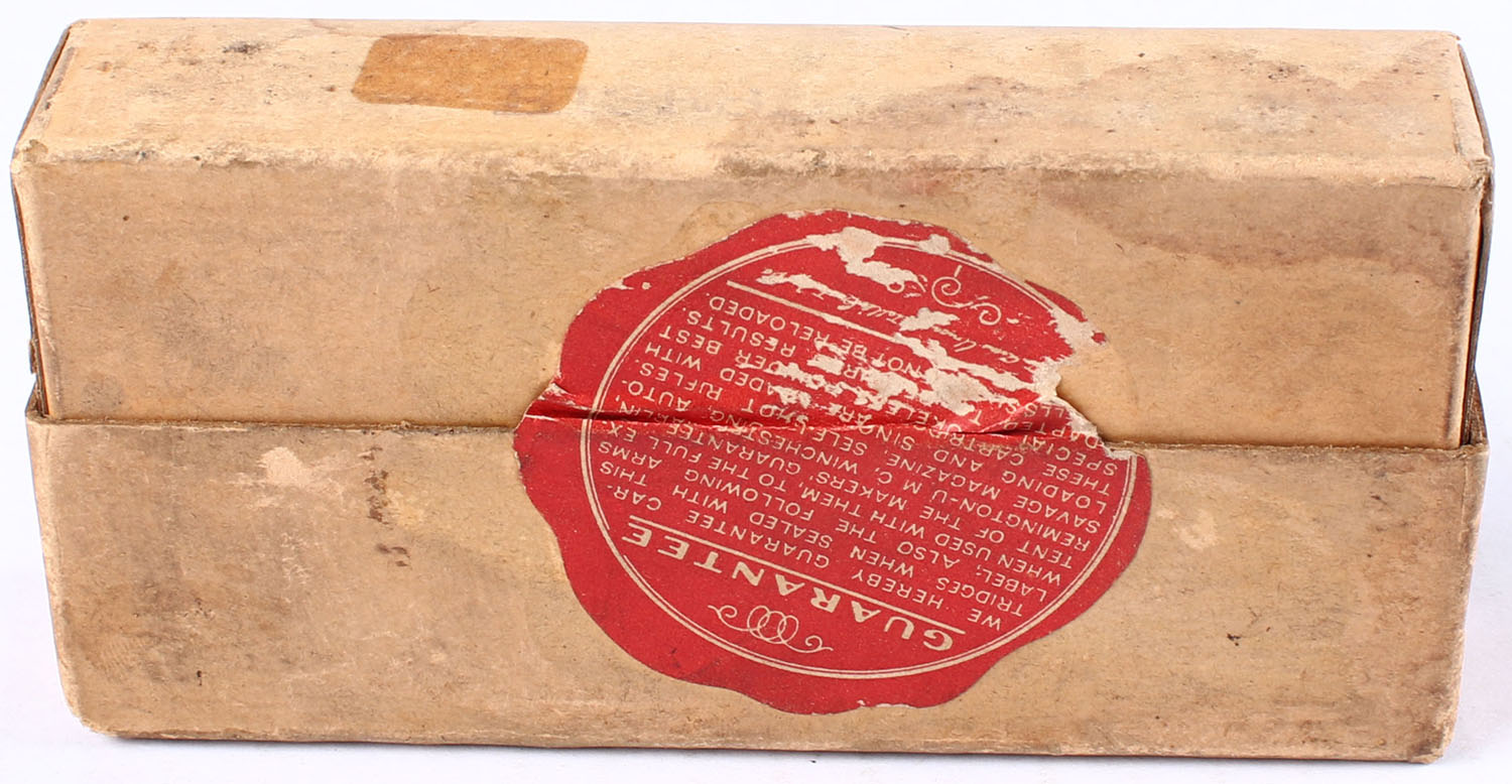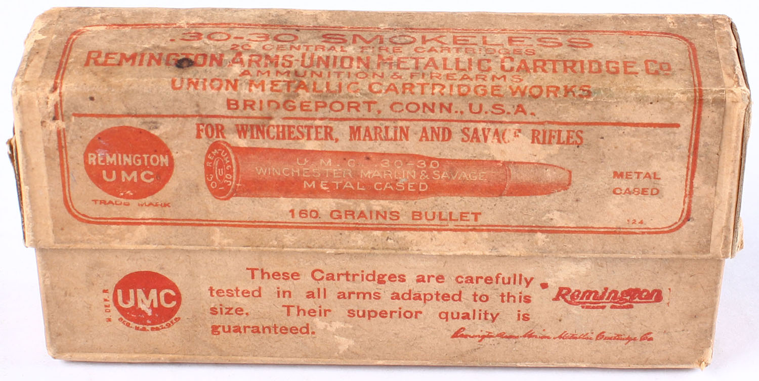 REM-UMC, .30-30, Smokeless Powder, 160 Grain Bullet, FULL & SEALED, 2pc. Buff box with buff & red labels, box is solid with good color, age soiling with scuffing, edge & corner wear, labels are intact. Grade: Excellent - Value: 20 to 60