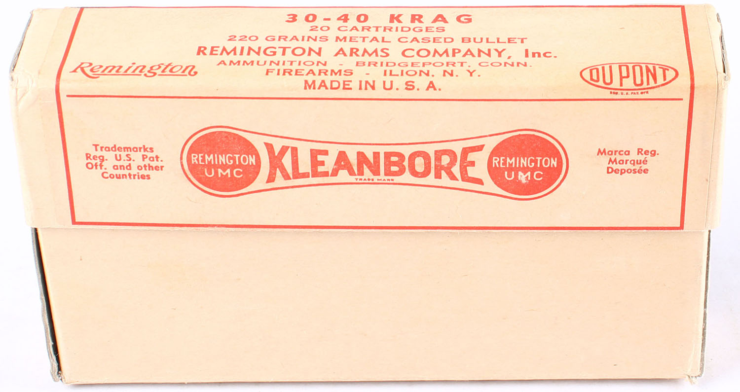 REM-UMC, Kleanbore, .30-40 Krag, 220 Grain Metal Cased Bullet, Partial 19rds, 2pc. Buff box with buff dog bone label, box is very solid with excellent color, edges are mostly crisp, label is intact, ammo is excellent. Grade: Excellent ++ - Value: 20 to 50