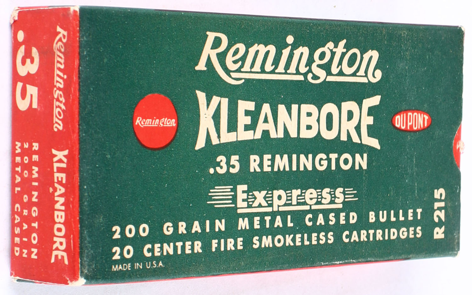 Remington, Kleanbore Express, .35 Remington, 200 Grain Soft Point Bullet, Full, 1pc. Green red & white box, box is very solid, end flaps are solid, ammo is mint. Grade: Excellent + - Value: 30 to 80