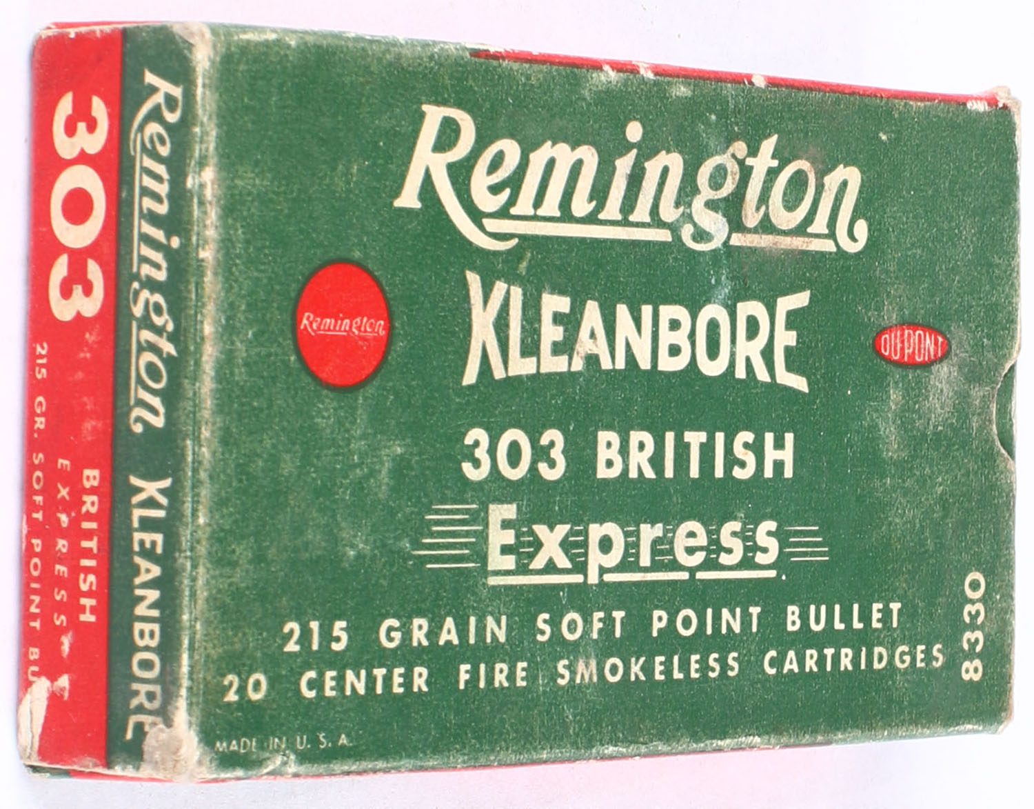 Remington, Kleanbore Express, .303 British, 215 Grain Soft Point Bullet, Full, 1pc. Green red & white box, box is very solid with some light wear, end flaps are solid, ammo is excellent. Grade: Excellent - Value: 30 to 90
