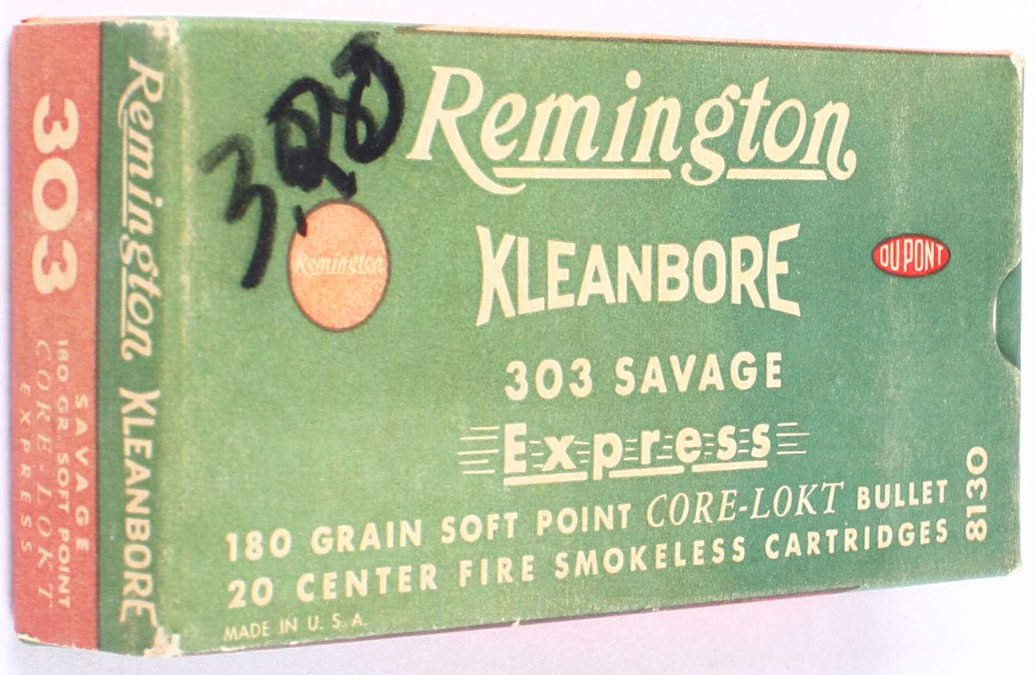Remington, Kleanbore Express, .303 Savage, 180 Grain Soft Point Core-Lokt Bullet, Full, 1pc. Green red & white box, box is very solid with some fading, end flaps are solid, ammo is mint. Grade: Very Good ++ - Value: 20 to 80