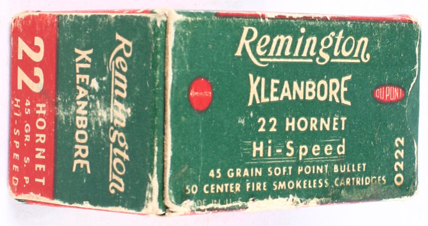 Remington, Kleanbore Hi-Speed, 22 Hornet, 45 Grain Soft Point Bullet, Full, 1pc. Green red & white box, box is solid with edge wear, very nice colors, end flaps are solid, ammo is excellent, has RARE side label stating to NOT USE AGAINST YOUR ENEMY BUT TO USE IS AS SURVIVAL CONDITIONS ONLY. Grade: Very Good ++ - Value: 50 to 200