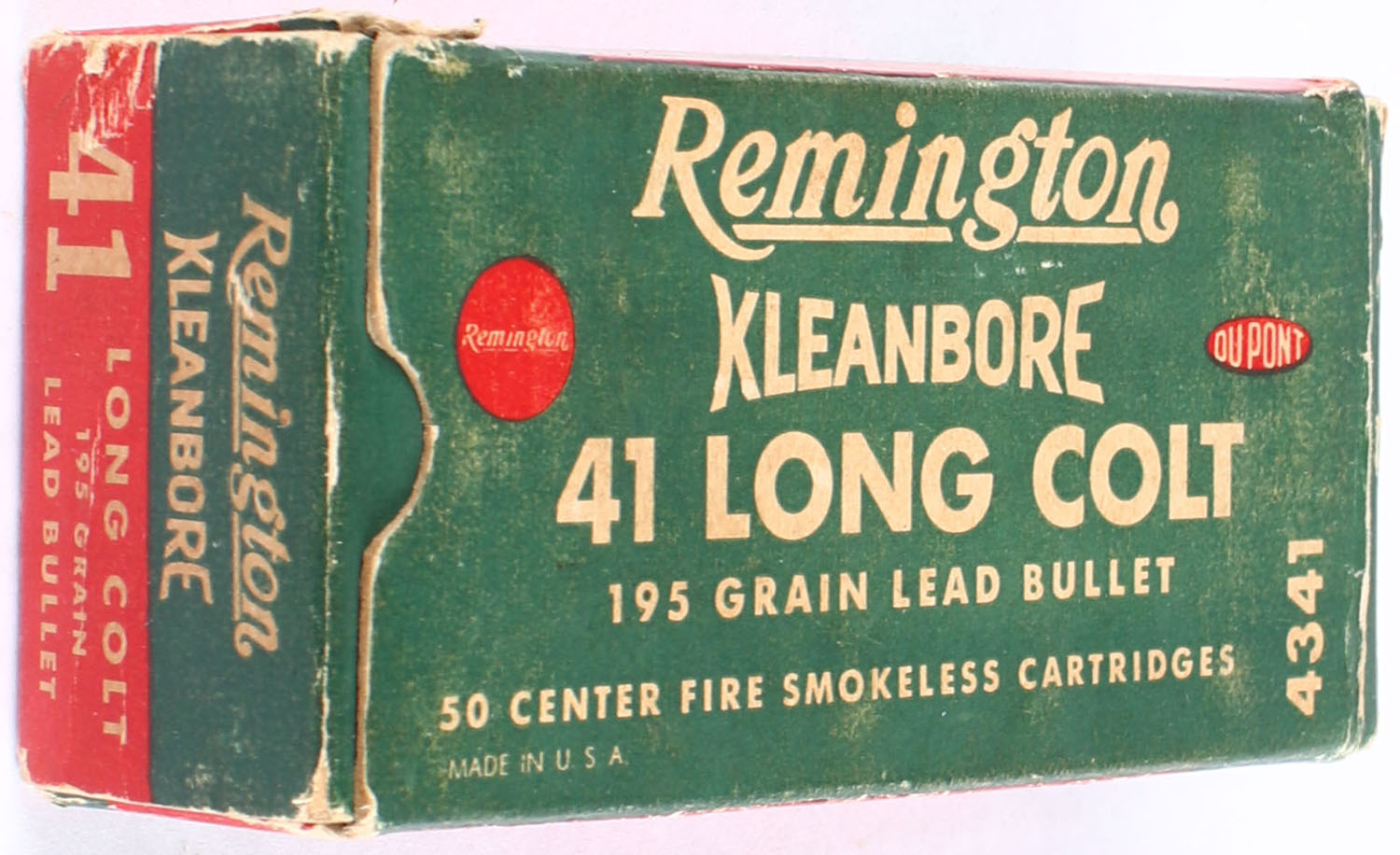 Remington, Kleanbore, .41 Long Colt, 195 Grain Lead Bullet, Full, 1pc. Green white & red box, box is solid with very good color, minor age soiling & color fading, some tape repair, some edge & corner wear, right end flap is torn, ammo is excellent. Grade: Very Good - Value: 60 to 180