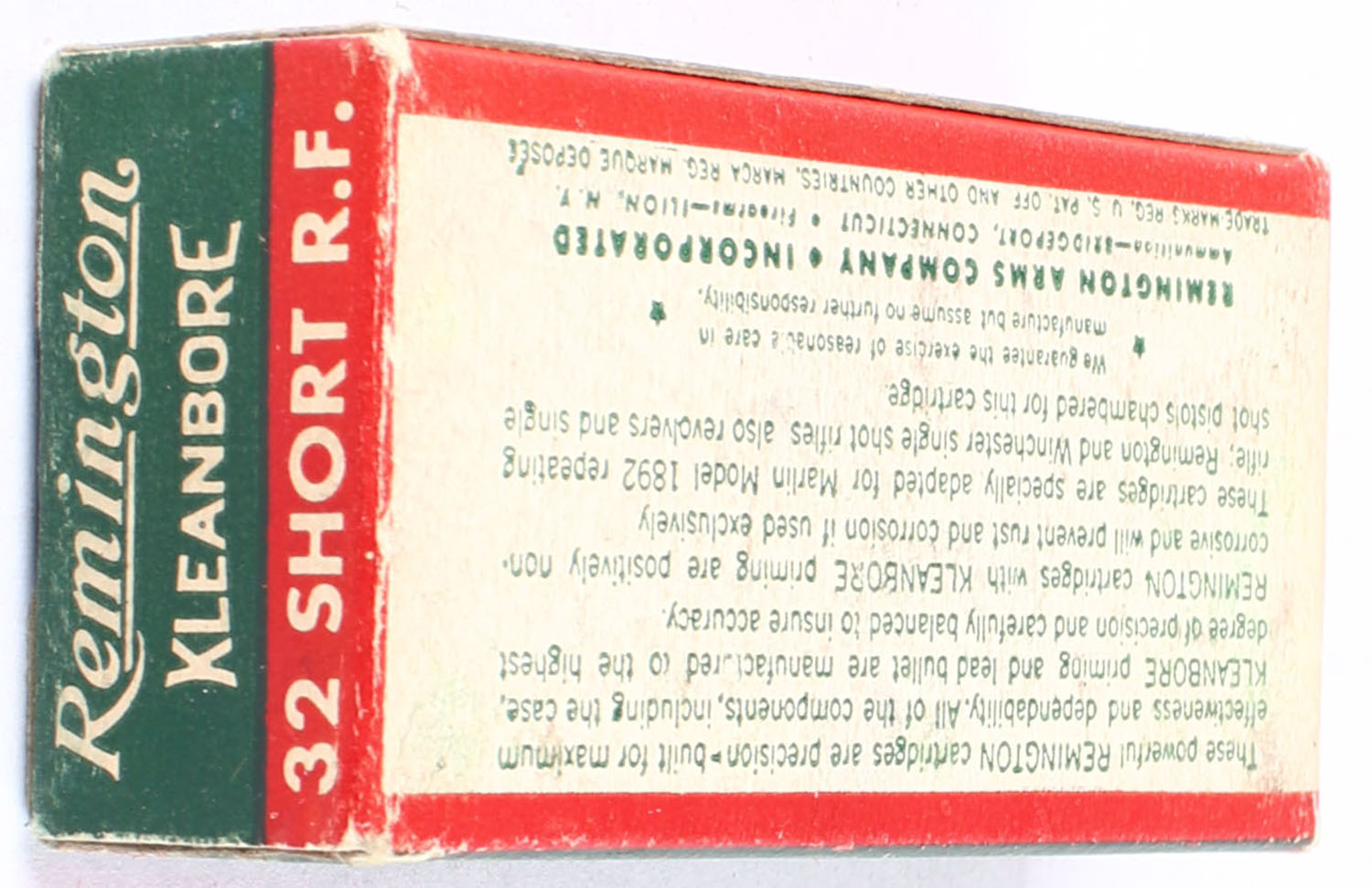 Remington, Kleanbore, .32 Short Rim Fire, Full, 1pc. Green buff & red box, box is very solid with excellent color, very minor corner wear, end flaps are solid, ammo is excellent. Grade: Excellent + - Value: 90 to 130