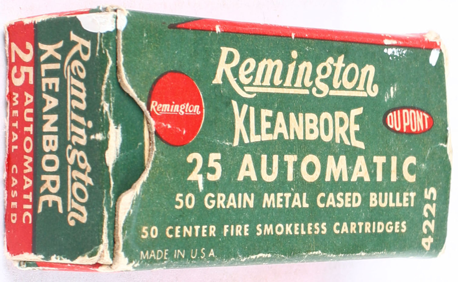 Remington, Kleanbore, .25 Automatic, 50 Grain Metal Cased Bullet, Full, 1pc. Green buff & red box, box is solid with very good to excellent color, minor age soiling & corner wear, edges are mostly crisp, end flaps are solid, ammo is minty. Grade: Very Good - Value: 20 to 30