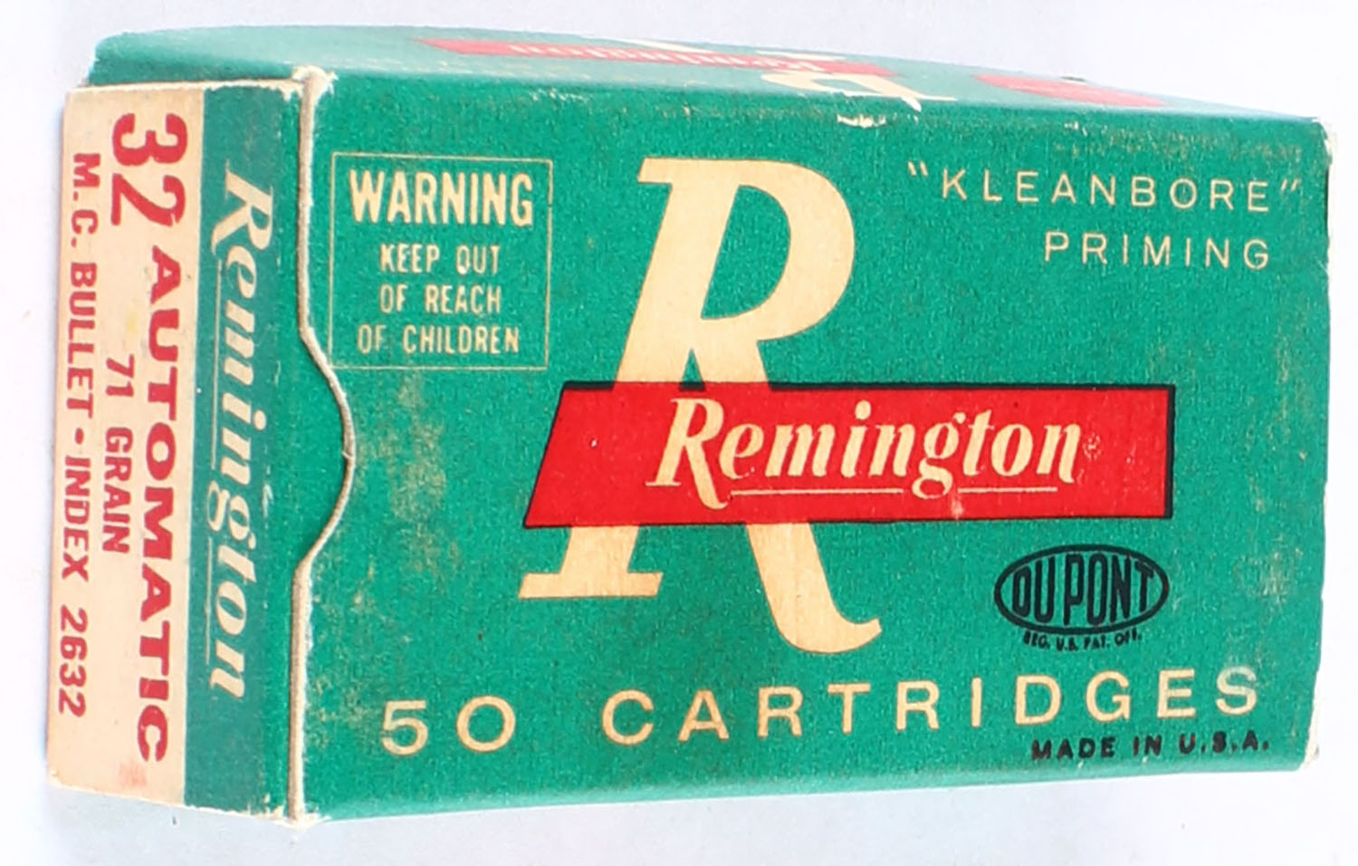 Remington, Center Fire Cartridges, .32 Auto., 71 Grain Metal Case, Full, 1pc. Green white & red box, box is solid with very good color, some age soiling & shelf wear, ammo is excellent. Grade: Very Good ++ - Value: 10 to 30