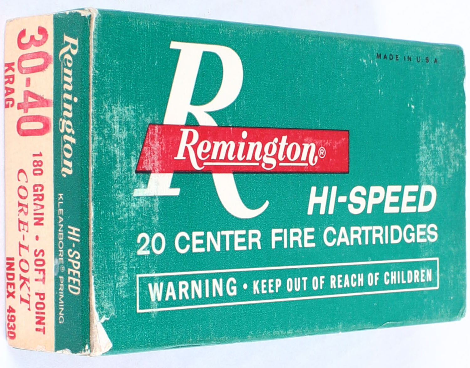 Remington, .30-40 Krag, 180 Gr. PTD Soft point Core-Lokt Bullet, 1pc, Full, Green white & red box, box is solid with great color with light rubbing, ammo is excellent. Grade: Excellent + - Value: 30 to 90