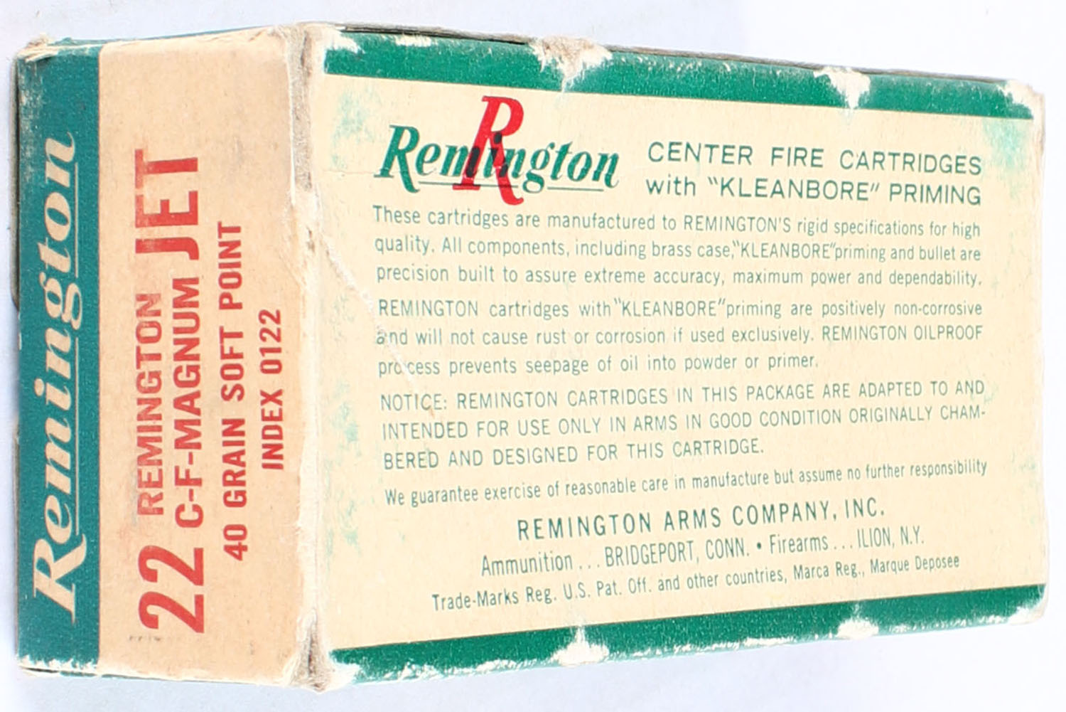 Remington, .22 Remington Jet C-F Magnum, 40 Gr. Soft point Bullet, 1pc, Full, Green white & red box, box has scuffing and edge wear, ammo is excellent. Grade: Very Good ++ - Value: 30 to 90