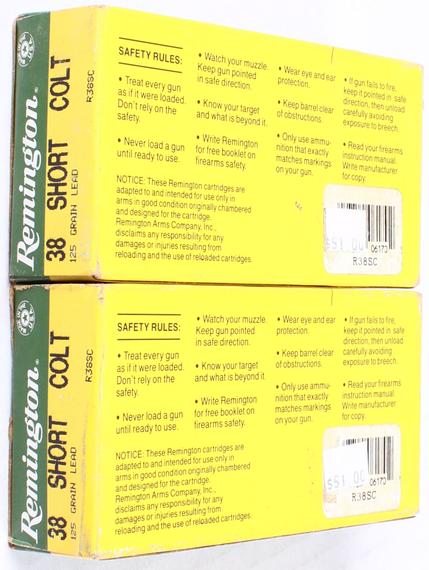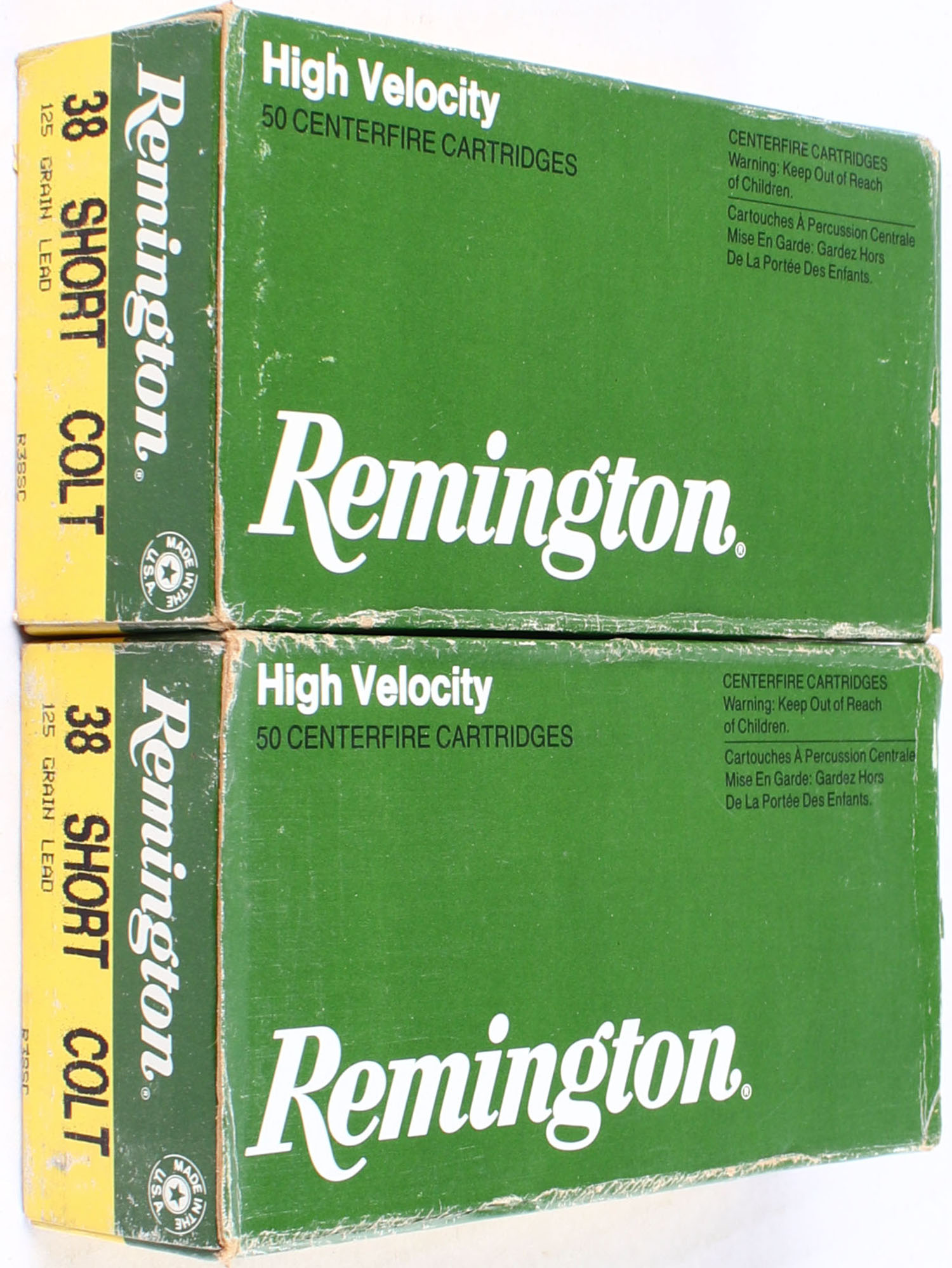 Lot of 2 Remington, High Velocity, .38 Short Colt, 125 Grain, Full, 1pc. Green & yellow boxes, boxes are solid, ammo is excellent. Grade: Excellent - Value: 20 to 60