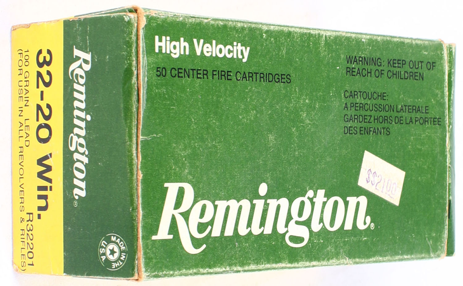 Remington, High Velocity, .32-20 Win., 100 grain lead, Partial 40 rds, 1pc. Green & yellow box, box is solid, end flaps are solid, ammo is excellent. Grade: Excellent - Value: 16 to 40