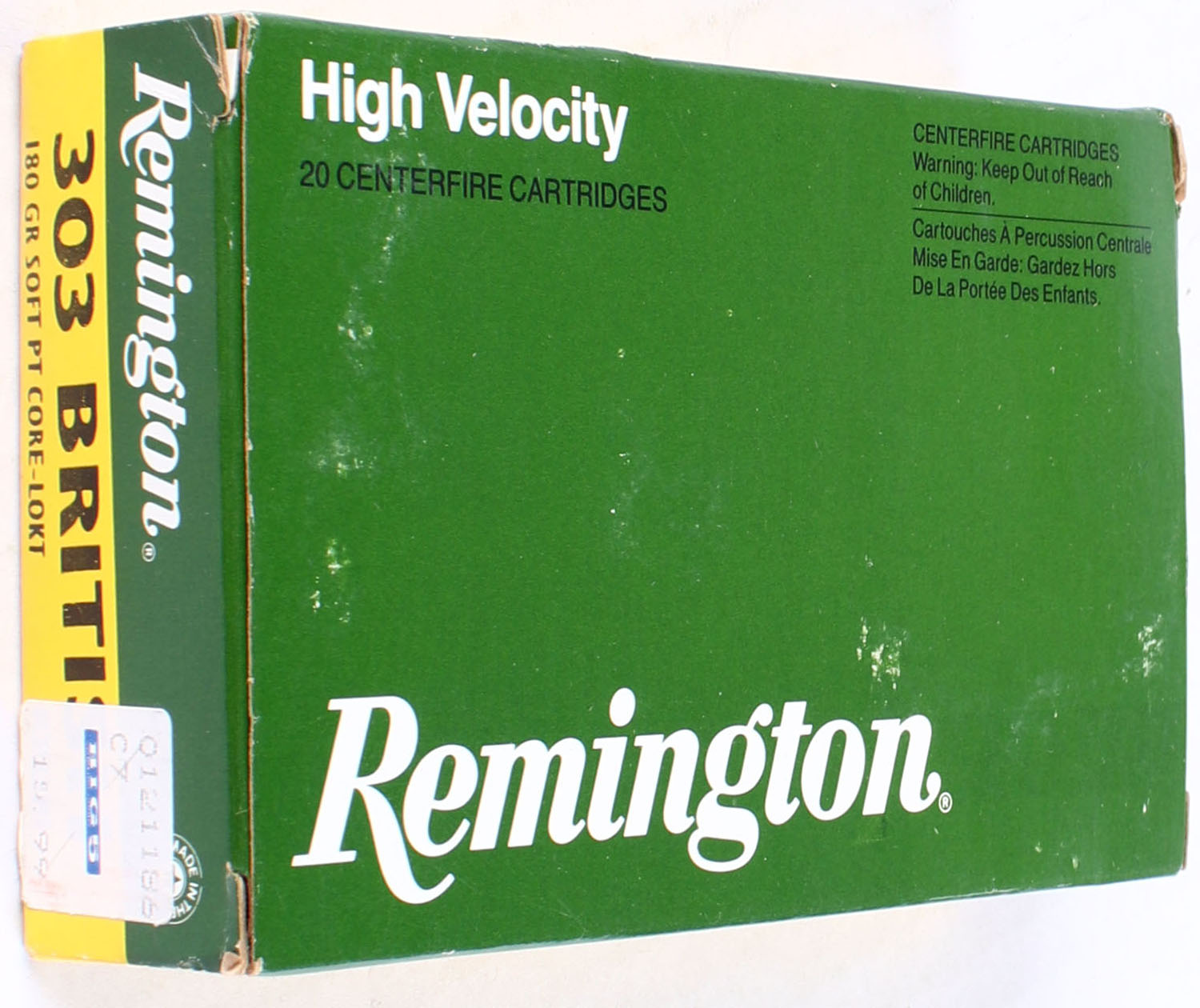 Remington, High Velocity, .303 British, 180 Grain Soft Point Coke-Lokt, Full, 1pc. Yellow, green box with black & white print, box is solid, ammo is excellent. Grade: Excellent + - Value: 20 to 50