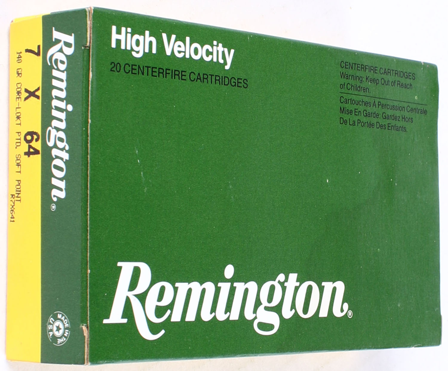 Remington, High Velocity, 7x64, 140 Grain Soft Point Coke-Lokt PTD., Full, 1pc. Yellow, green box with black & white print, box is solid, ammo is excellent. Grade: Excellent + - Value: 20 to 60