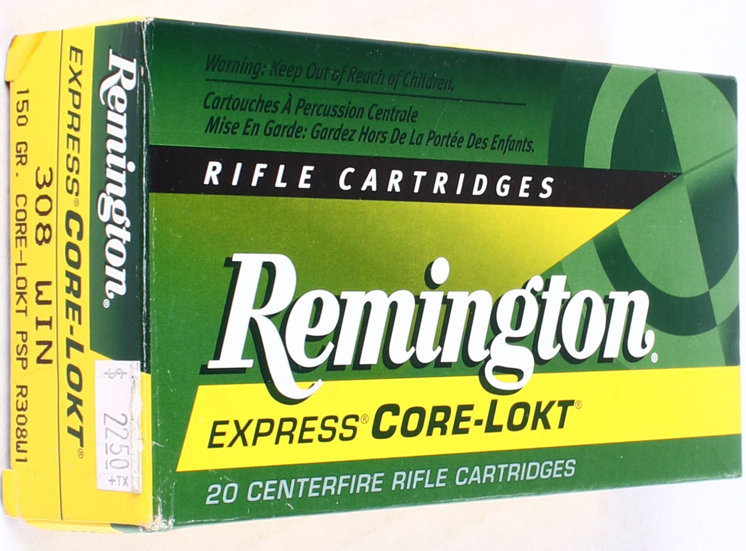 Remington, Express Core-Lokt, .308 Win, 150 Grain Core-Lokt PSP, 1pc, Full, multi-colored box, box is solid, ammo is excellent. Grade: Excellent - Value: 26 to 50