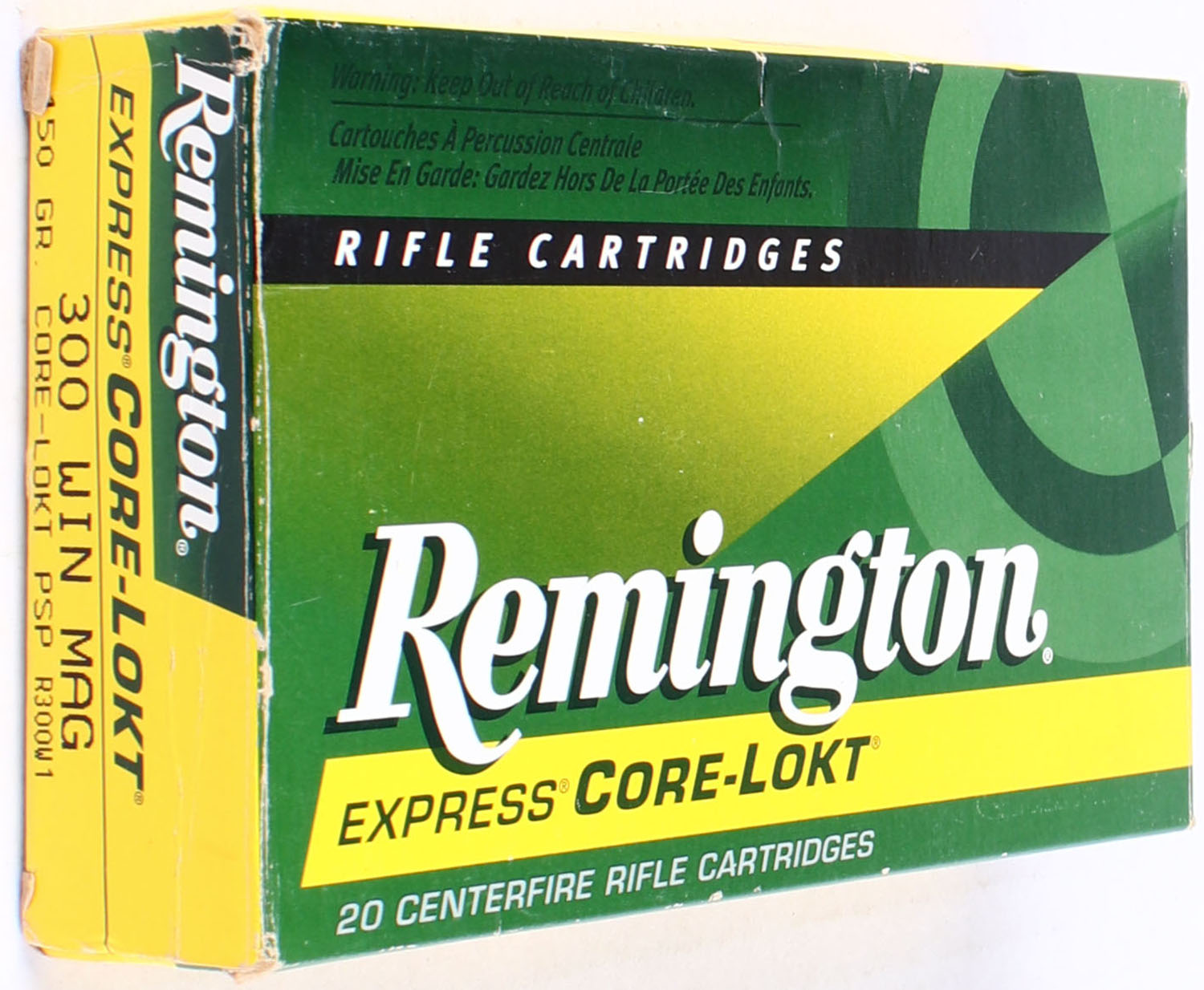 Remington, Express Core-Lokt, 300 Win Mag, 150 Grain Core-Lokt Pointed PSP, Full, 1pc. Yellow green & white box, box is solid with great color, end flaps are solid, ammo is excellent. Grade: Excellent + - Value: 20 to 40