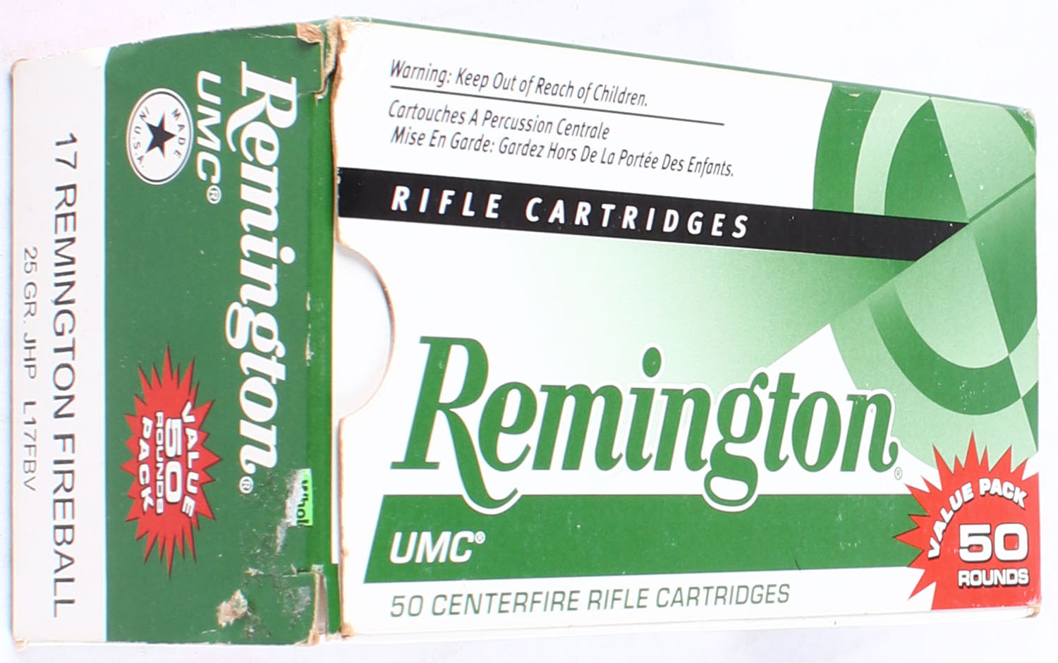 Remington, UMC, .17 Rem fireball, 25 Grain JHP, Full, 1pc., green, white & black box, box is solid with great color, light corner wear, end flaps are solid, ammo is excellent. Grade: Excellent - Value: 20 to 80