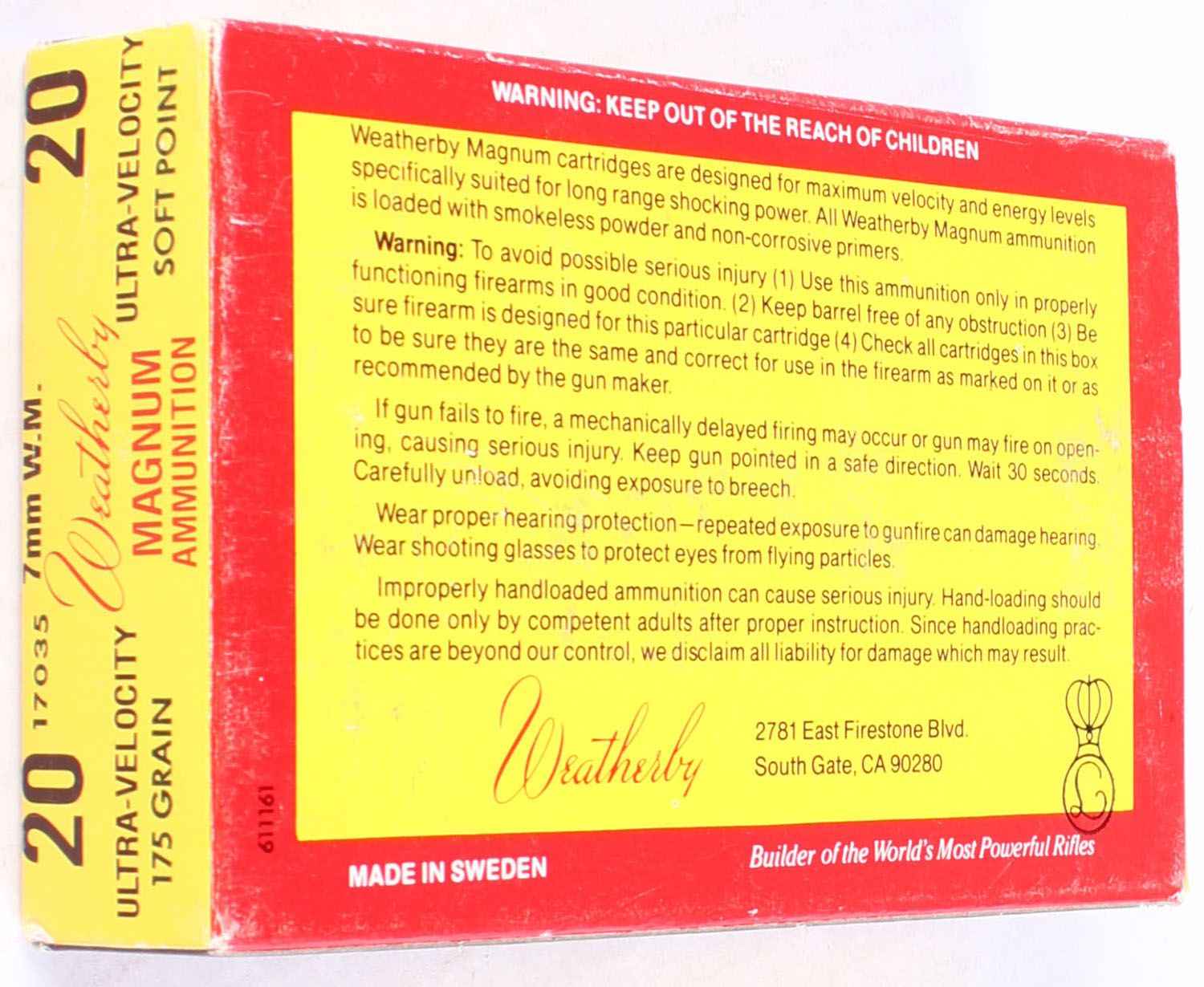 Weatherby, Ultra-Velocity Ammunition, 7mm WM., 175 Grain Soft Point, Full, 1pc., multi-colored Tiger box, box is solid with very good color, some scuffing, end flaps are solid, ammo is excellent. Grade: Excellent + - Value: 36 to 70