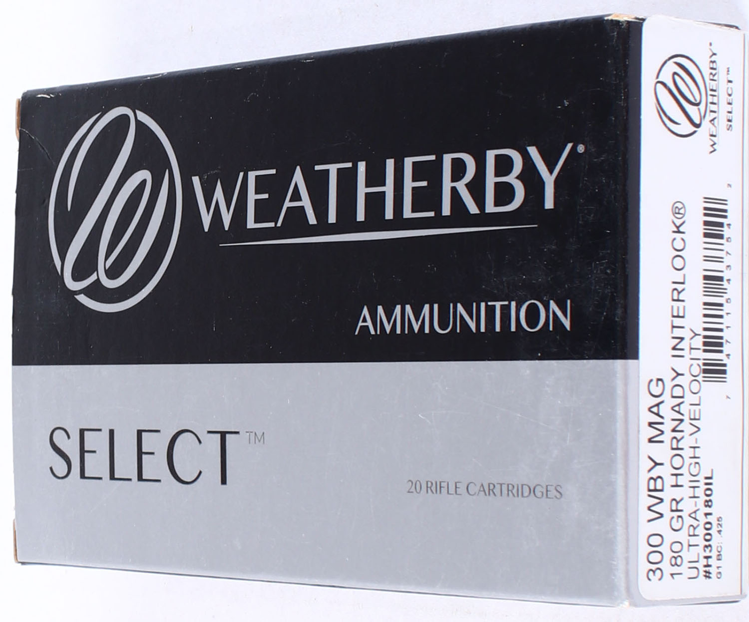 Weatherby Select, Ultra-High Velocity Ammunition, .300 WBY MAG, 180 Grain Hornady interlock, Full, 1pc. Multi-colored box, box is solid with excellent color, ammo is minty. Grade: Excellent - Value: 40 to 100