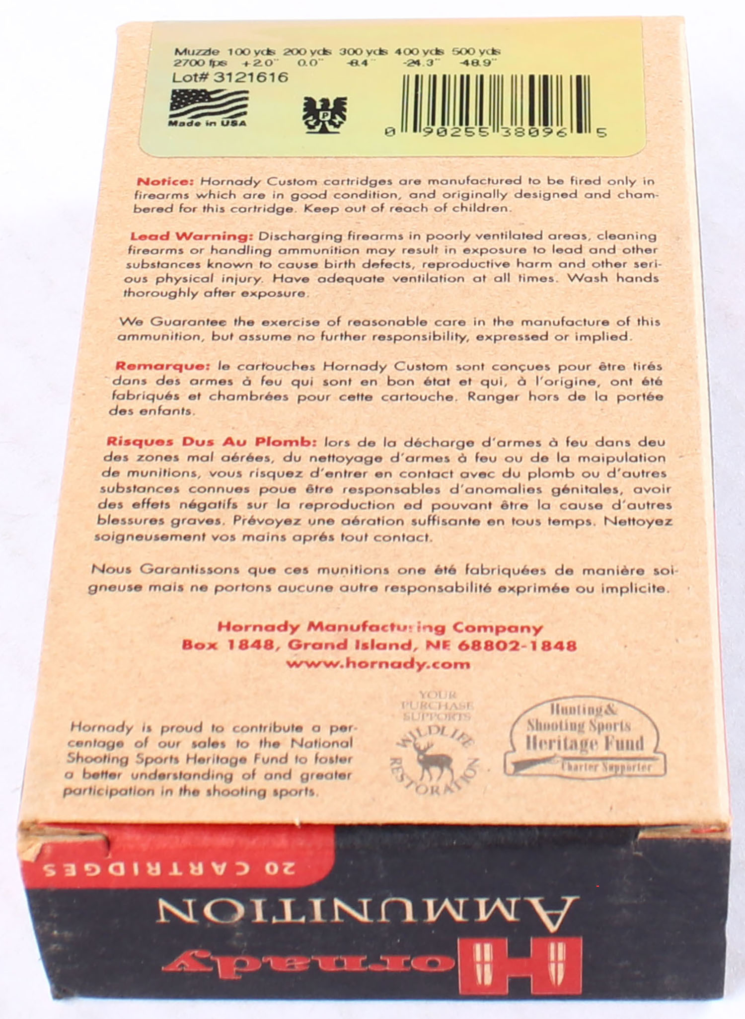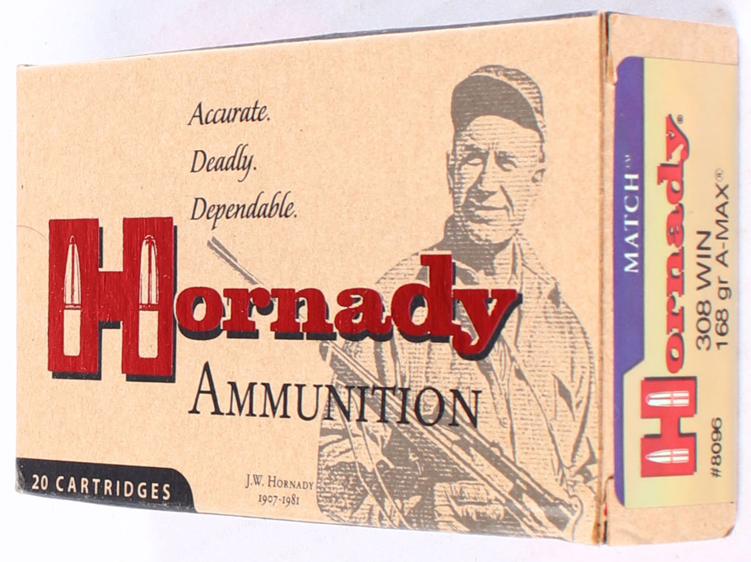 Hornady, Match, .308 Win., 168 gr A-max, Full, 1pc. multi-colored box, box is solid with excellent color, Ammo is excellent. Grade: Excellent ++ - Value: 26 to 50