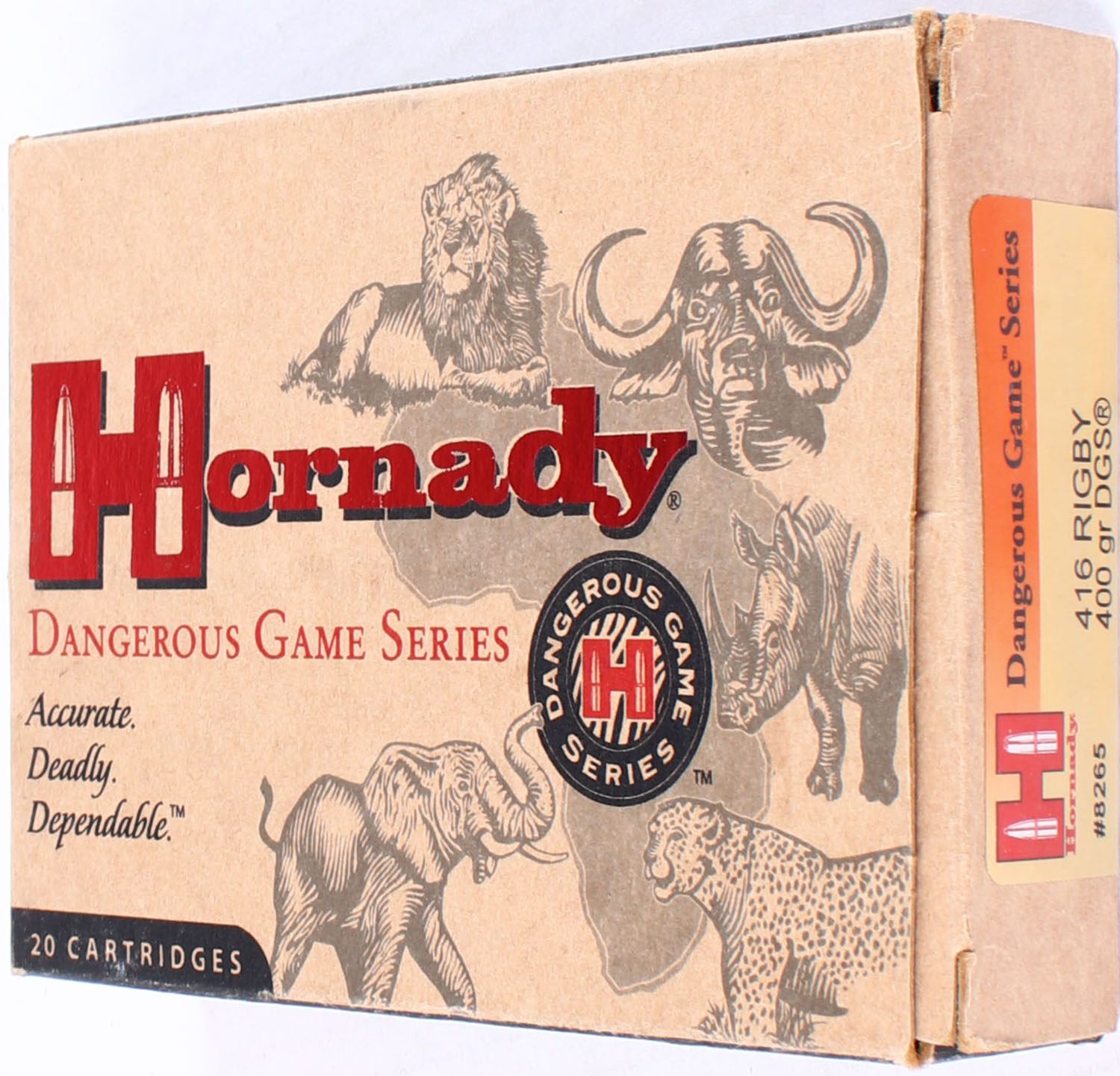 Hornady Dangerous Game Series, .416 Rigby, 400 Grain DGS, Full, 1pc. multi-colored box, box is solid with excellent color, Ammo is minty. Grade: Excellent ++ - Value: 40 to 80