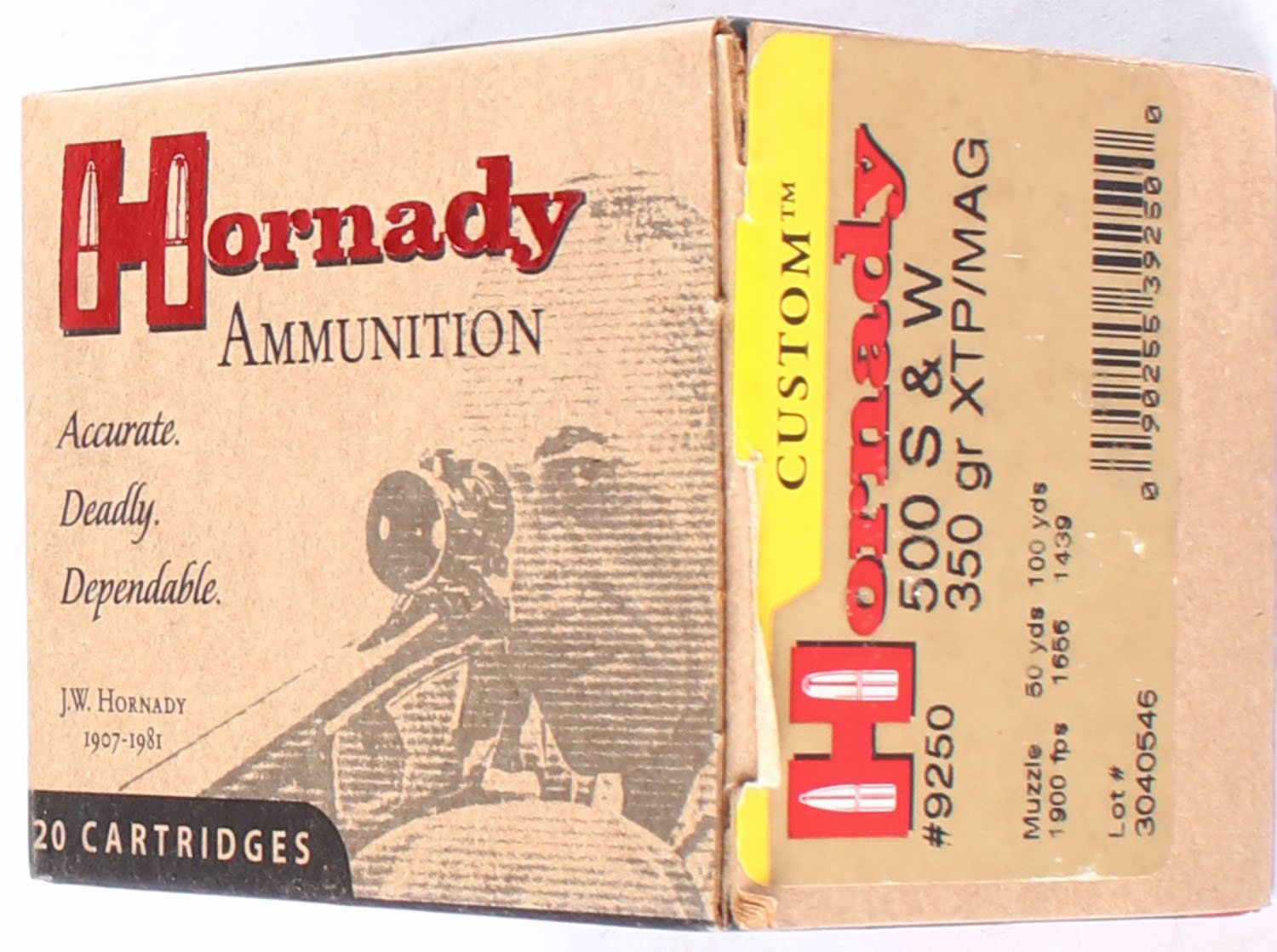 Hornady, Custom, 500 Smith & Wesson, 350 Grain XTP/ MAG, Full, 1pc, multi-colored box, box is very solid with excellent color, ammo is minty. Grade: Excellent ++ - Value: 30 to 60