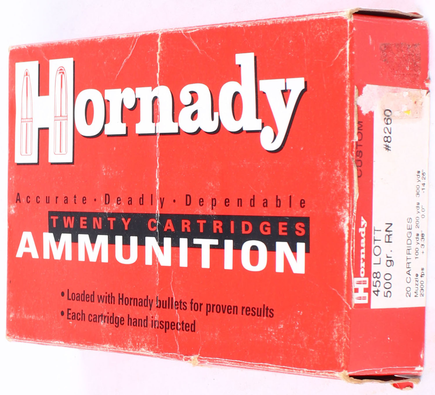Hornady, Ammunition, .458 LOTT, 500 Grain RN, Full, 1pc. Red black & white box, box is solid with, minor edge & corner wear, side flaps are solid, ammo is excellent to minty. Grade: Excellent - Value: 40 to 80